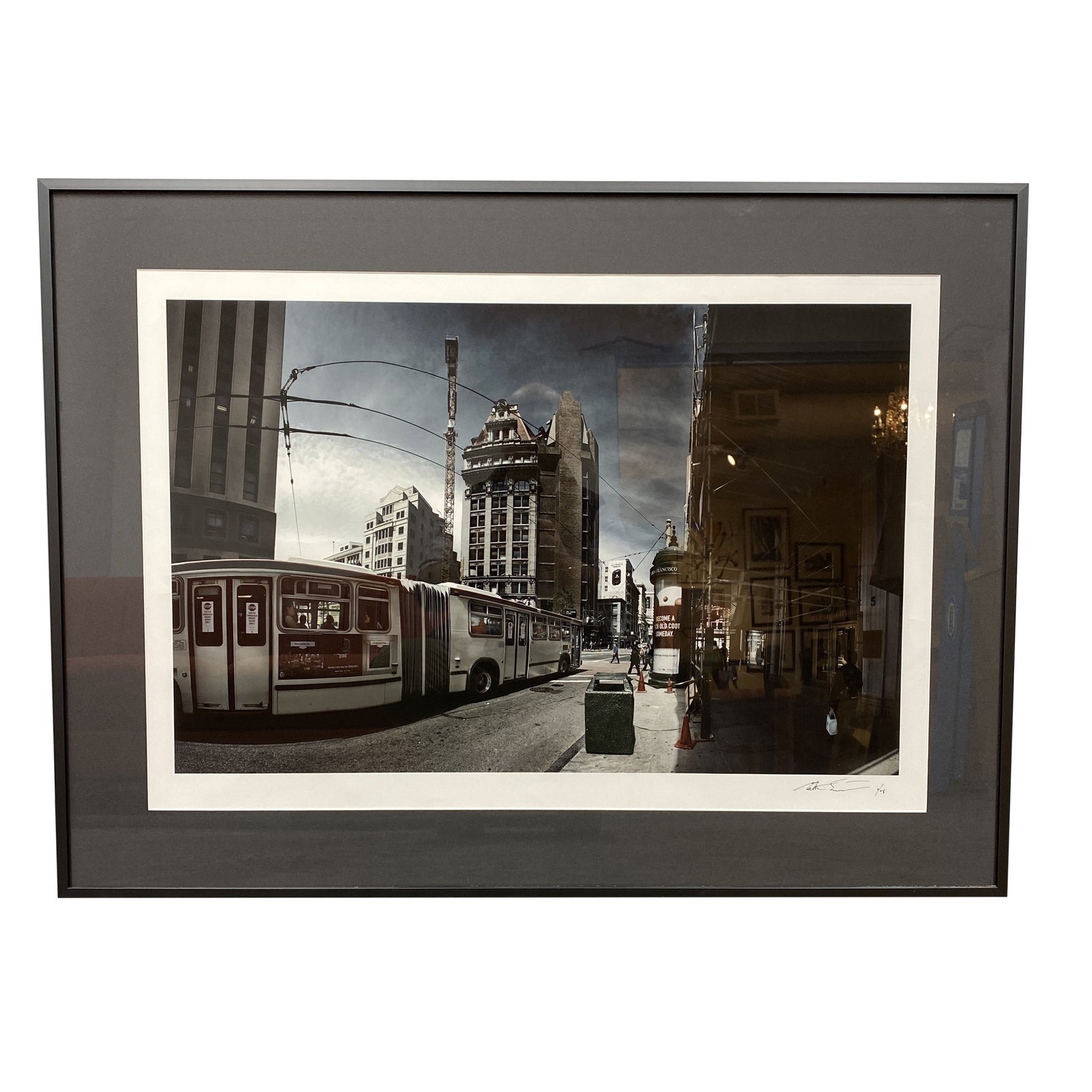 Design Plus Gallery presents a Matt Schriock “Market Street” Signed + Numbered 03/08 Custom Framed. Fisheye perspective captures a dynamic intersection at Market & Kearny in downtown San Francisco. Signed and numbered in the lower right corner. Bus lines, pedestrians, new construction, and iconic SF architecture intermix with the cloudy sky.