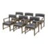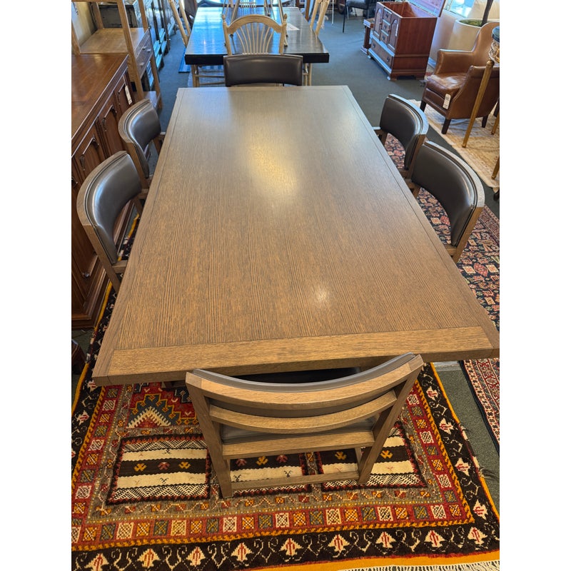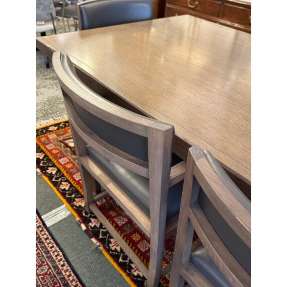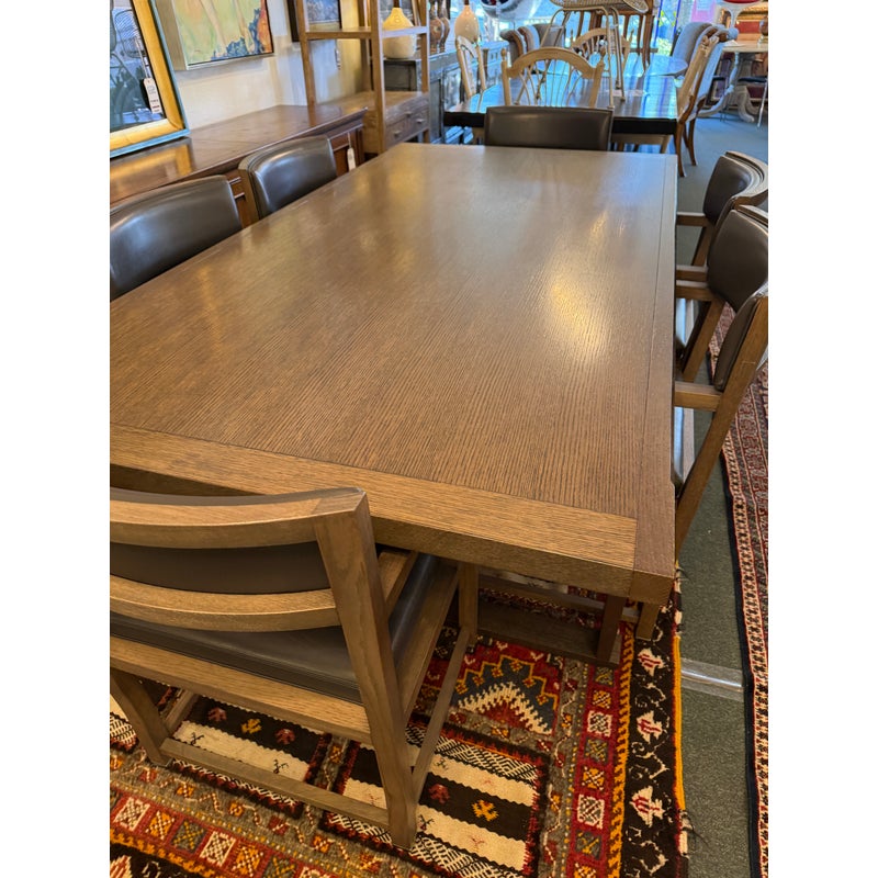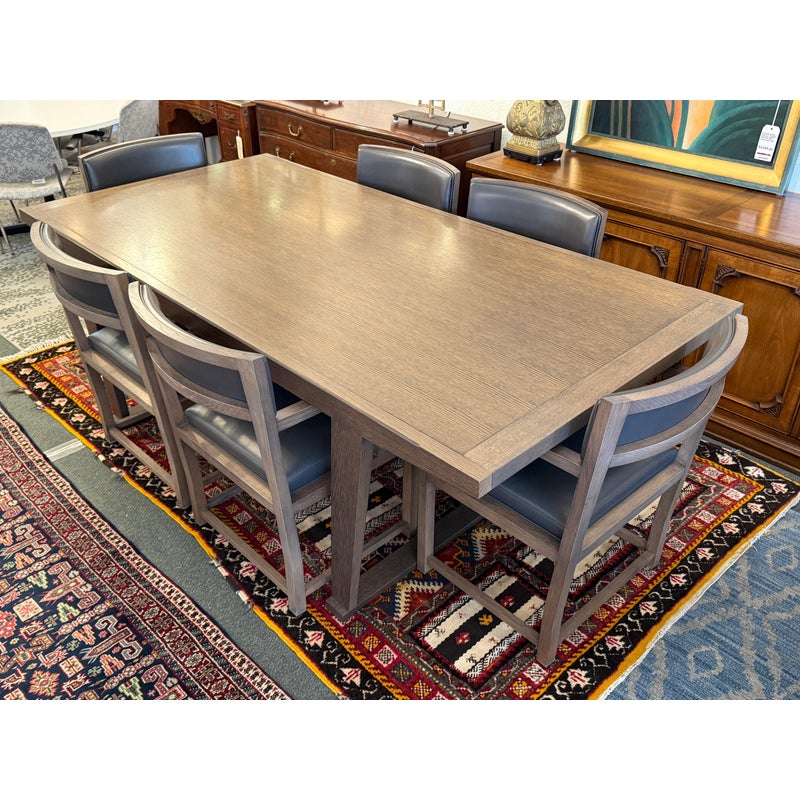 Design Plus Gallery presents the Set of Six Dining Chairs + an InToto Dining Table by Antonio Citterio for Maxalto + B&B Italia. The dining table is a minimalistic and characterized by its solid wood trestle structure and sturdy top. It has the smoked oak wood finish and shows minimal wear for its usage. The set of Simplice Armchairs have gray leather upholstery with matching smoked oak wood frames. They are designed with a curved upholstered back, open angular arms, and seat cushions. The set reflects the restrained lines associated with the design ethos of Maxalto. They are in good condition with visible and minimal wear from usage. Made in Italy.
