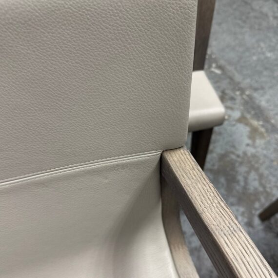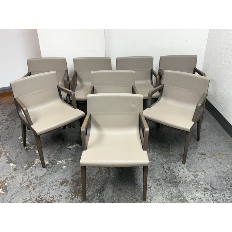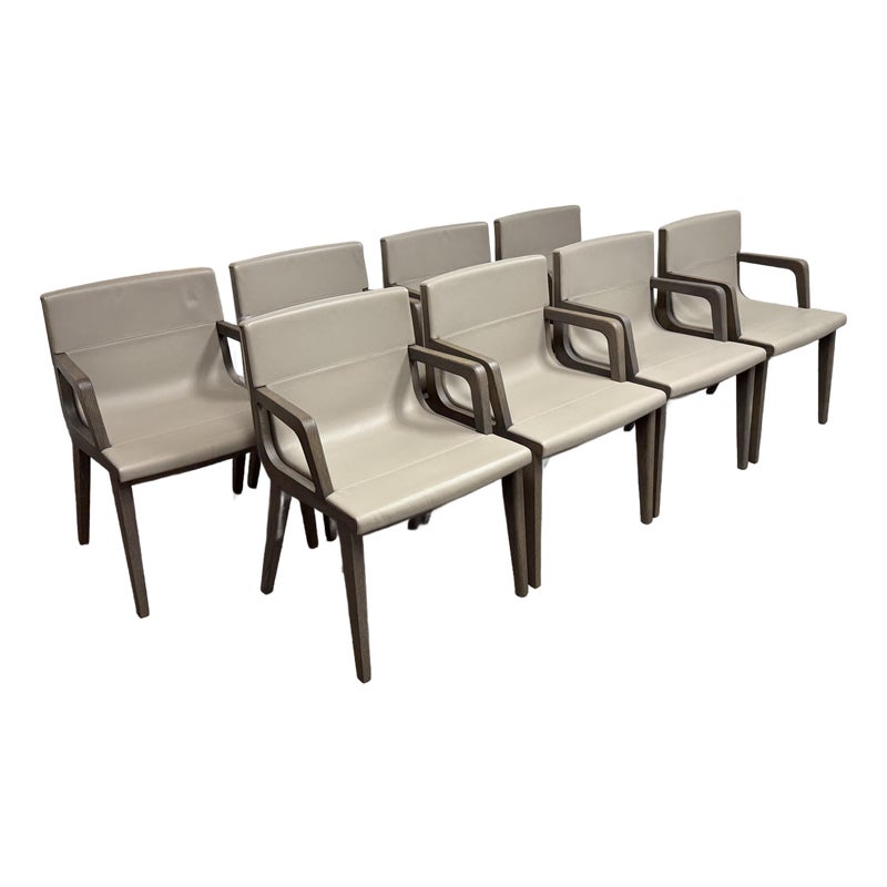 Design Plus Gallery presents a Set of Eight Acanto Armchairs Designed by Maxalto. Quite frankly, the perfect fusion of elegance and comfort. They offer a solid wood frame allowing for sturdy support. Plush leather seats make them versatile enough even to serve as a conversation chair, ensuring the same exceptional structural integrity and comfort. Their timeless design makes it an ideal addition to any living room, study, or office space. They are in good condition with minimal surface wear for their usage. Made in Italy.