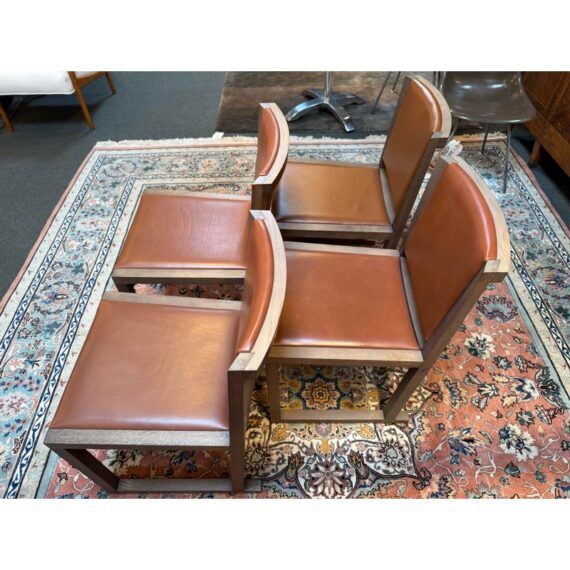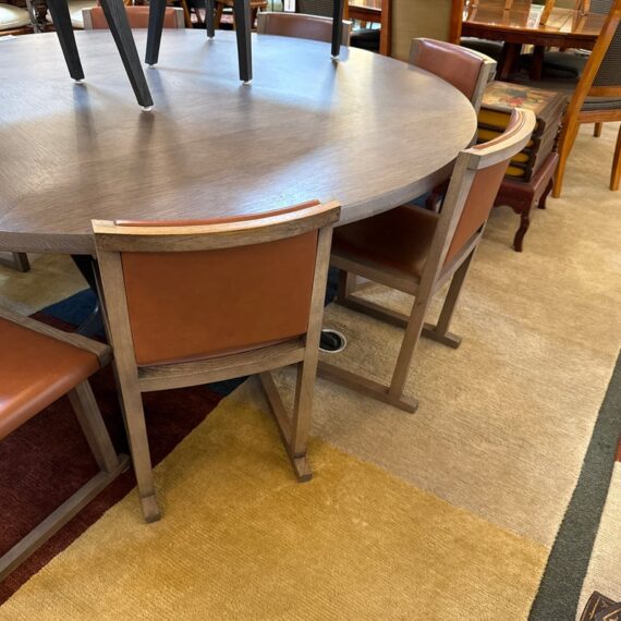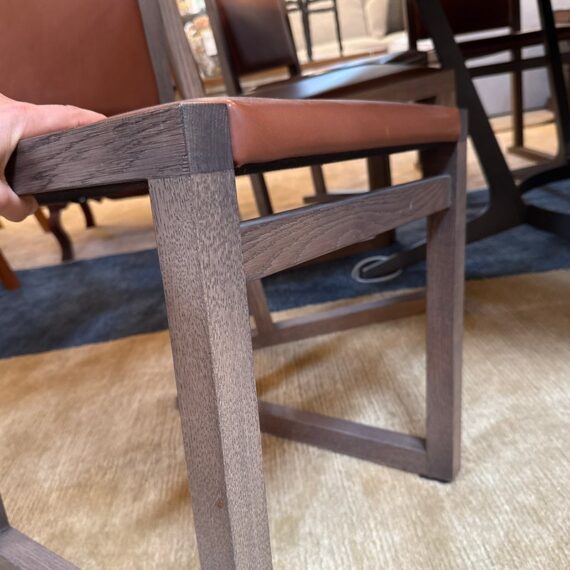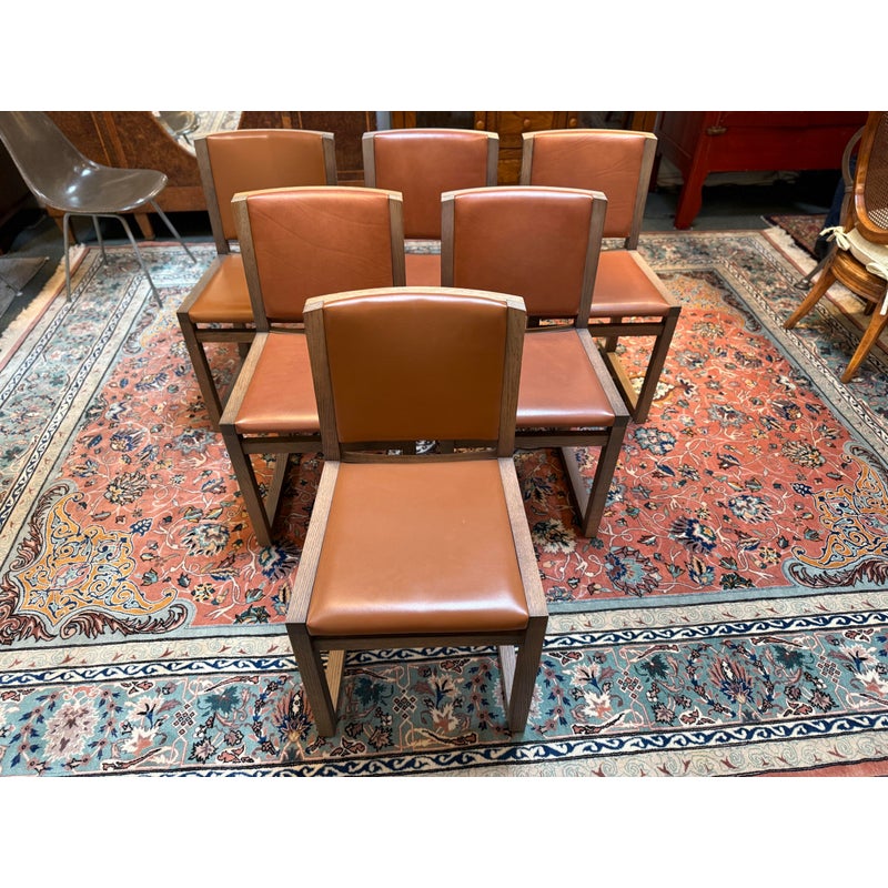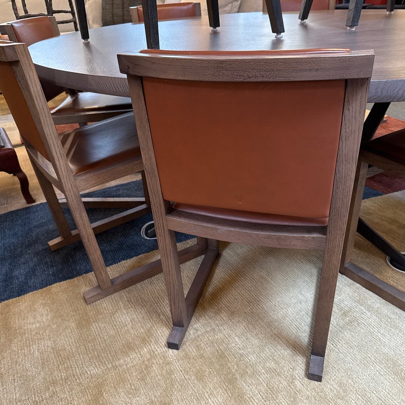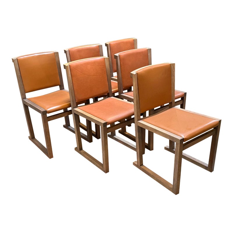 Design Plus Gallery presents a Set of 6 Musa Custom Dining Chairs by Maxalto. The Musa classic chair stands out for its solid wood frame in crisp, clean and timeless silhouette. Alfa 313 rich leather wraps the deeply cushioned seat and back. Light surface wear, two seat cushions have a scratch (shown); condition is consistent with age and use. Made in Italy.