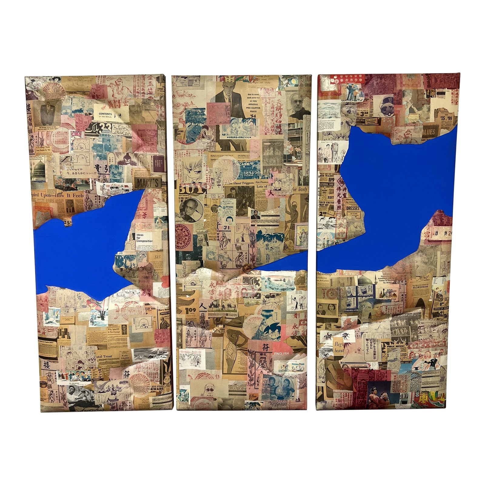 Design Plus Gallery presents a Maxine McClendon “Our Land” Triptych. A lot of Maxine’s work is based off of an aerial view of her interpretation of looking out a window from an airplane. This interesting layered takes that idea and merges collage of various media materials with. vibrating blue. The canvas is cut and sawn back together to create a puffed out texture. Little evidence of wear, triptych is in good condition. One of the original panels is missing. Set of three works beautifully together. Signed and dated by the artist on the backs of the panels.