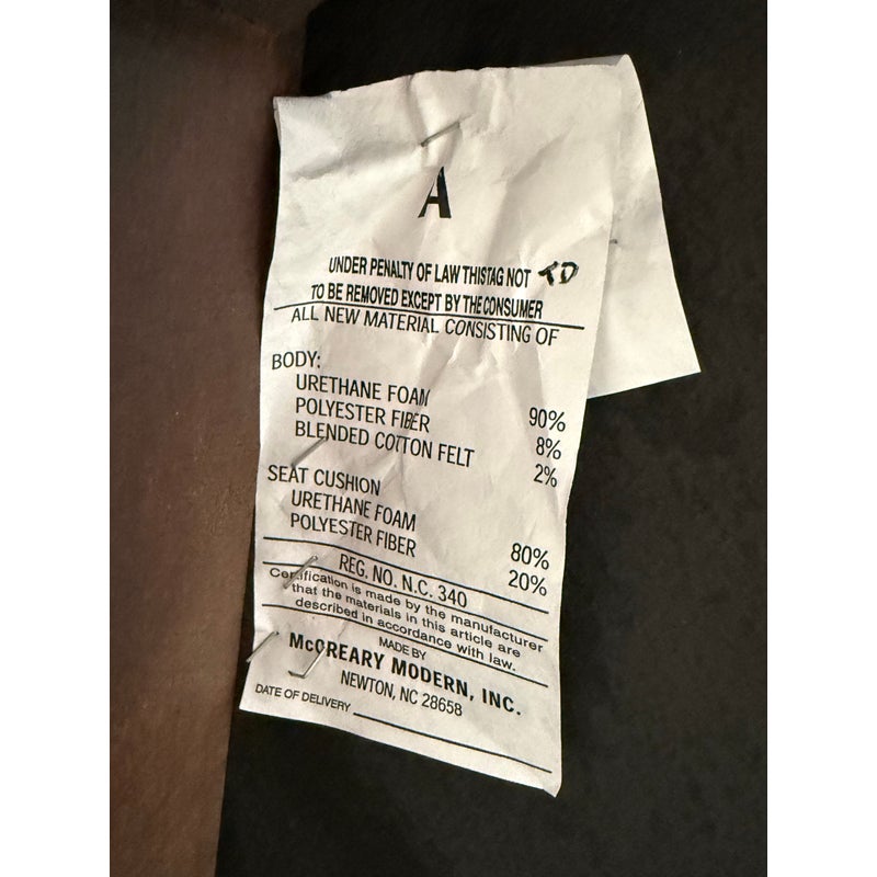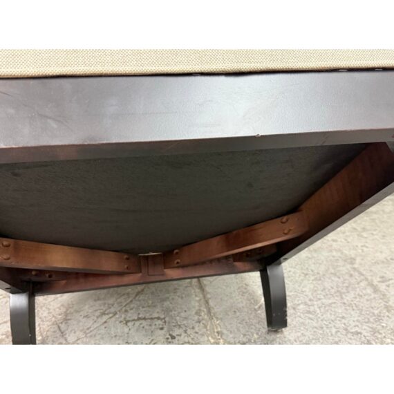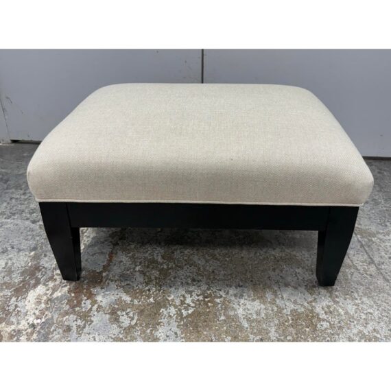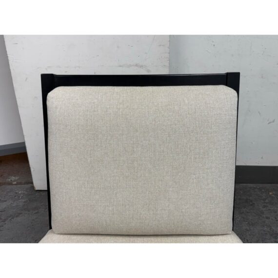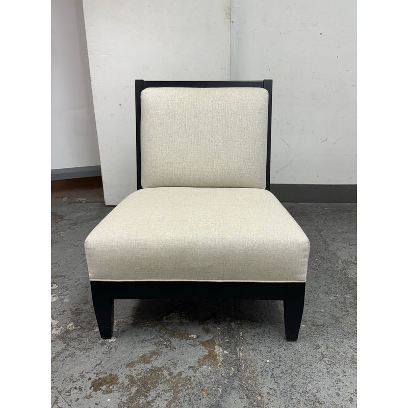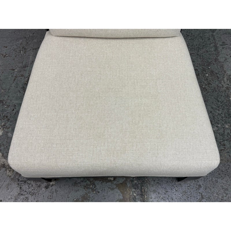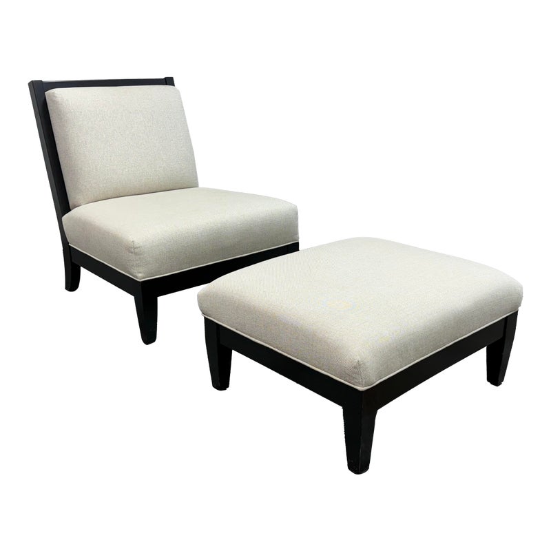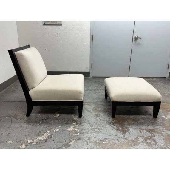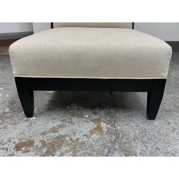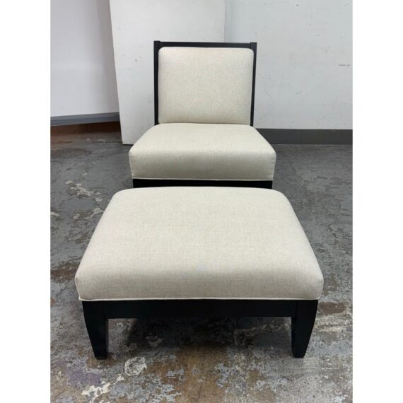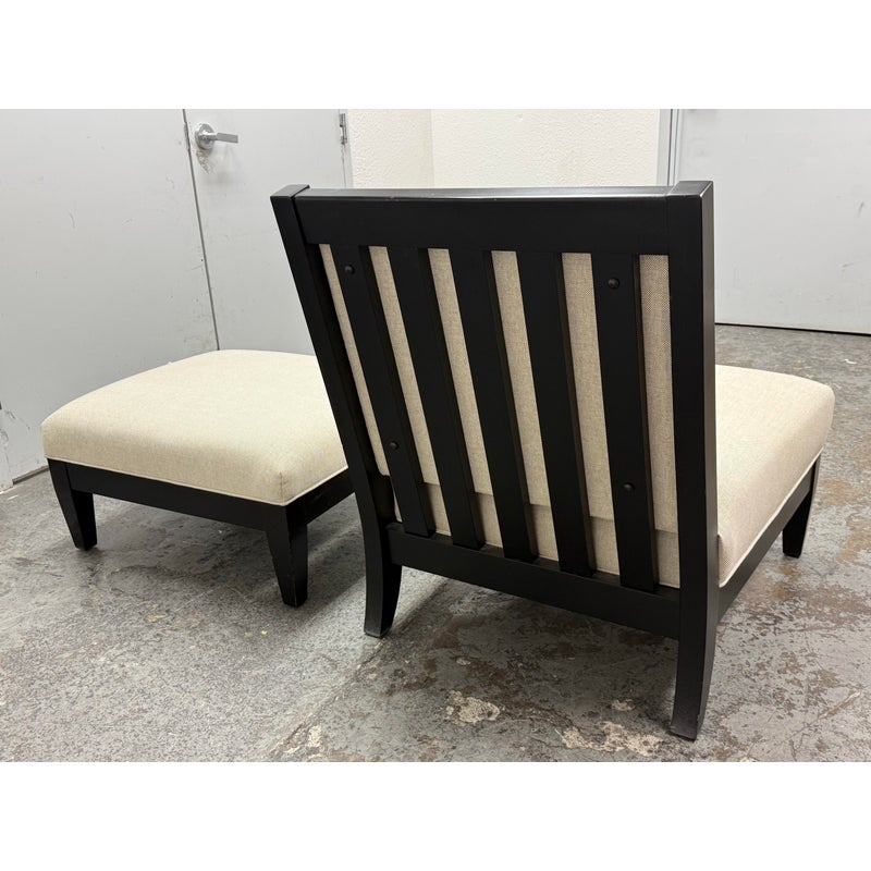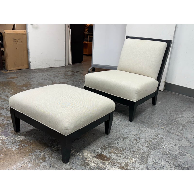 Design Plus Gallery presents an Armless Chair + Ottoman by McCreary Modern Concept. The low profile has an open and firm seat with matching ottoman for comfort and extra seating. Espresso stained satin finished wood legs are tapered. Upholstery is finished with a neutral woven fabric. Back is slatted for extra visual interest. Visible wear on the fabric from use (pictured) and minor wear on frame. This is a discontinued model. Made in North Carolina, USA.