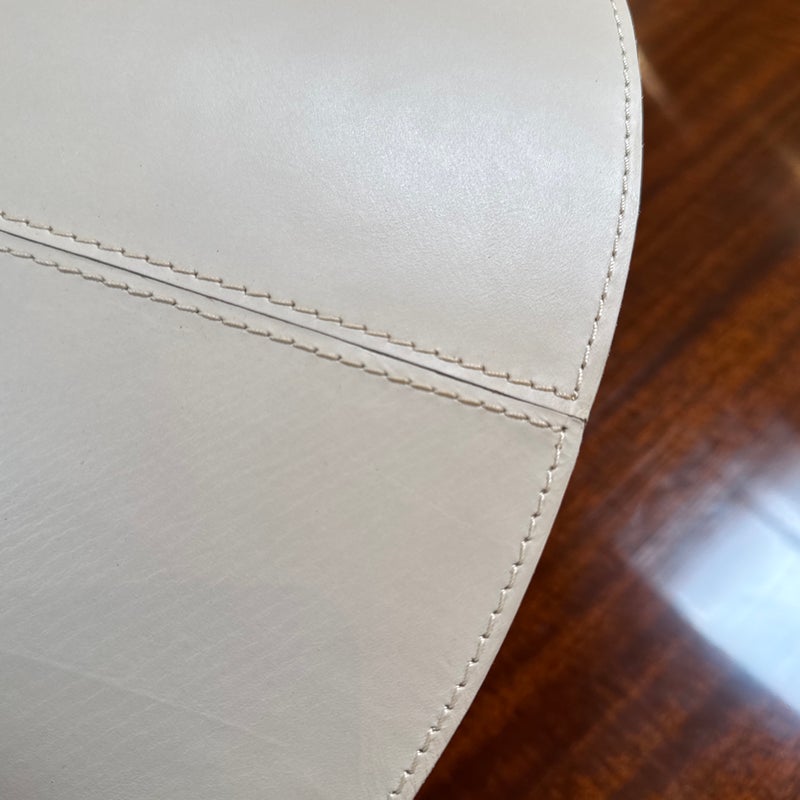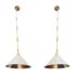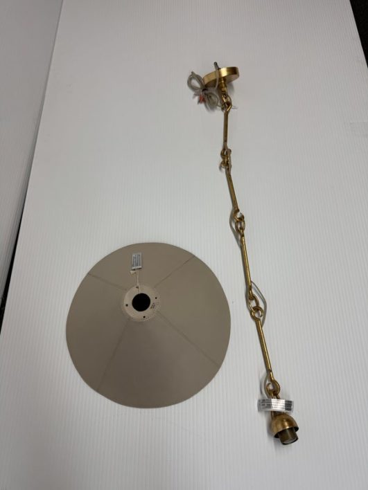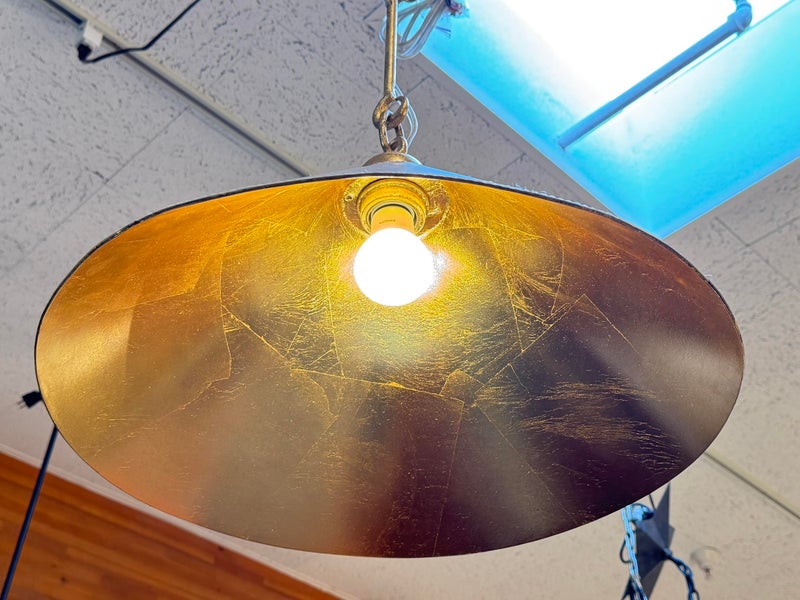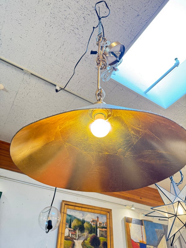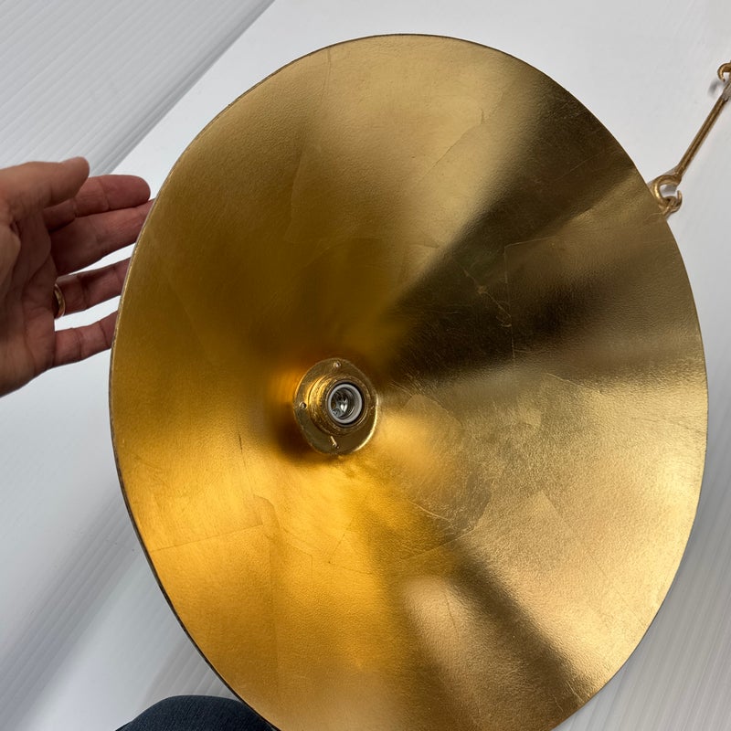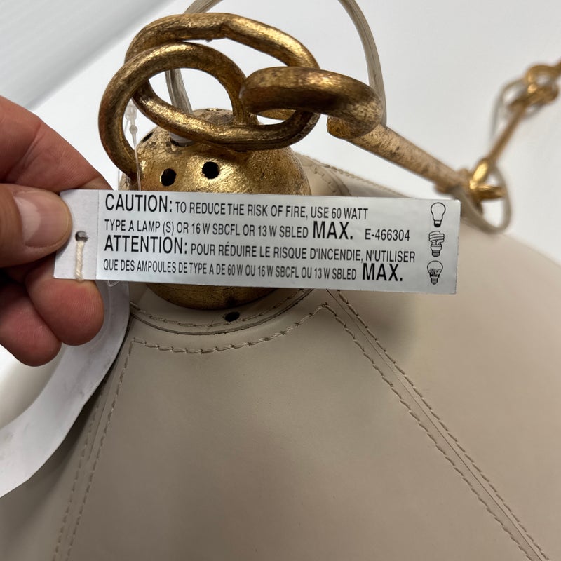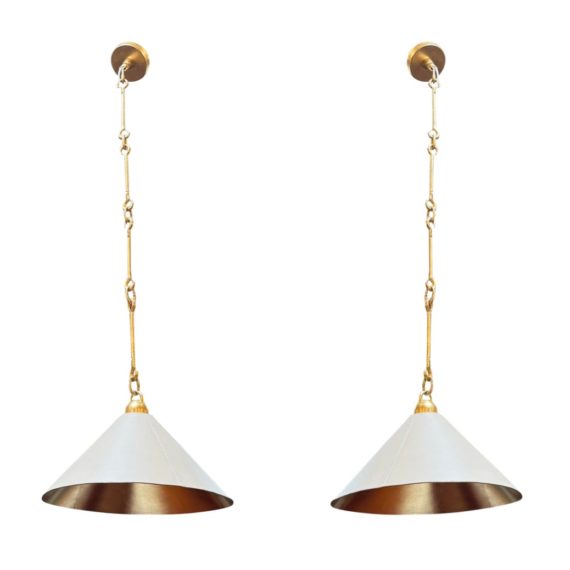 Design Plus Gallery presents a Pair of Scarlet Pendant lights by McGee & Co. Definitely creating the jewelry in your space, this lighting design is both casual and elegant. Crafted from a unique combination of gold leafed iron and ivory leather, this fixture simply exudes style. Each damp-rated fixture puts off warm and brilliant light, height adjustable. New condition.