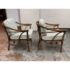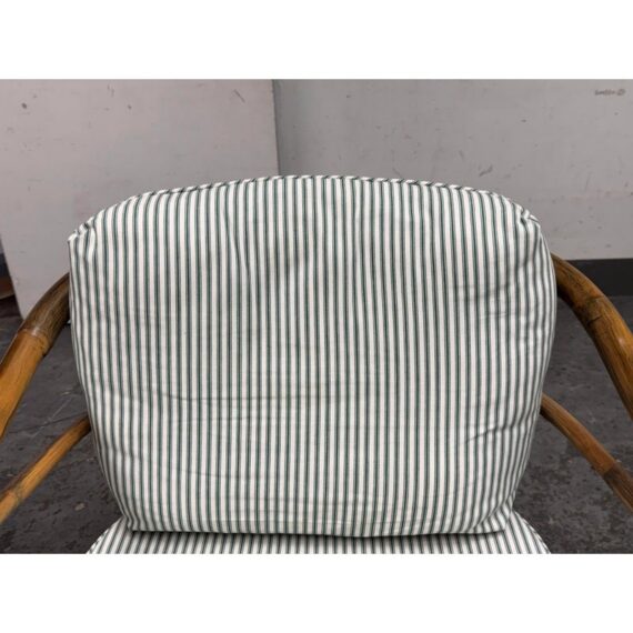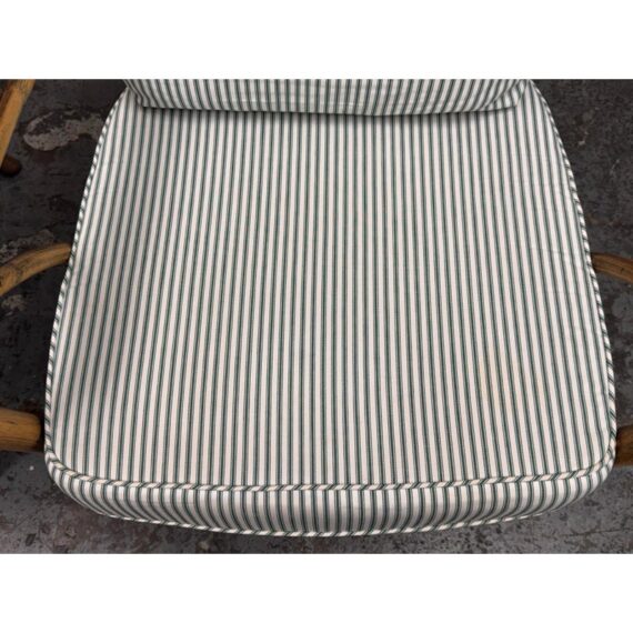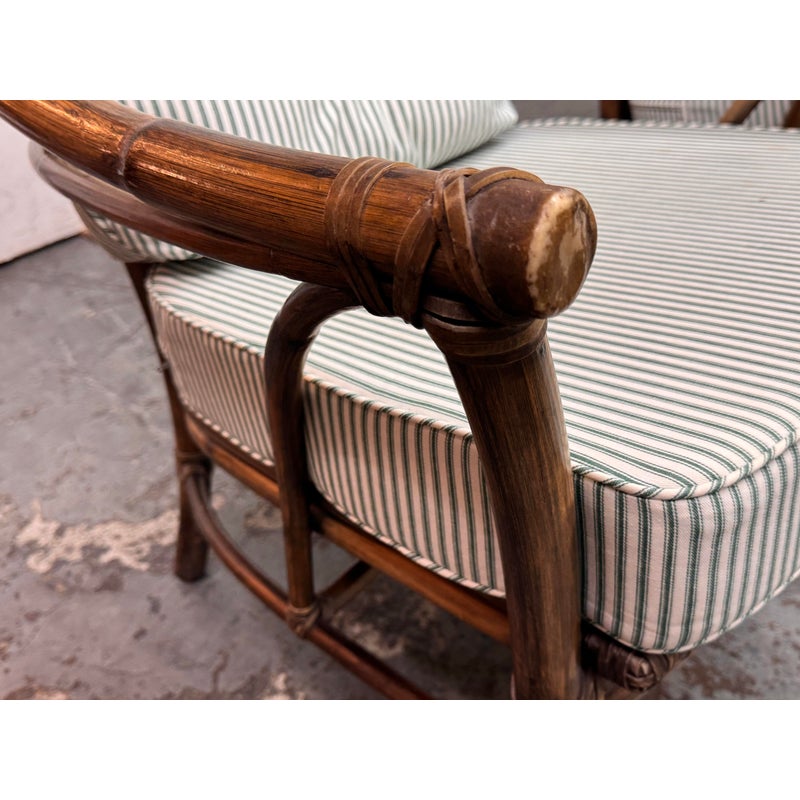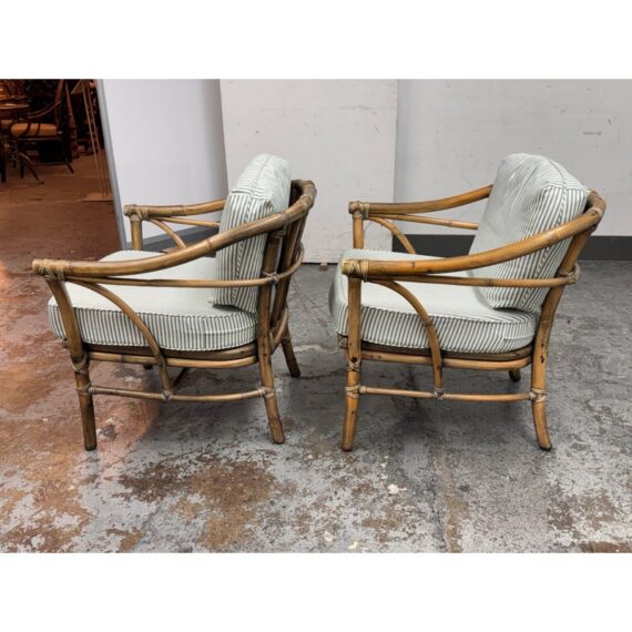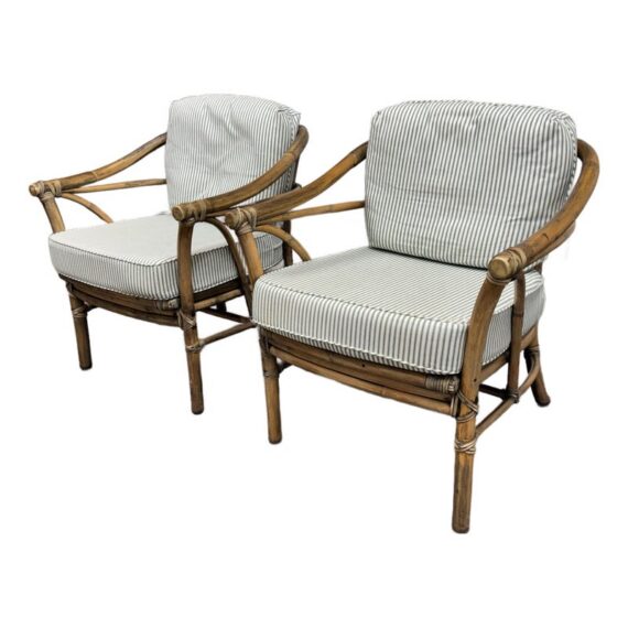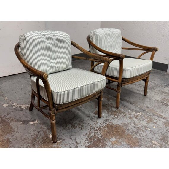 Design Plus Gallery presents a Pair of Circa 1970’s Club Chairs from McGuire Furniture. Hand-shaped rattan frames are bound with the brand’s signature rawhide lacing, giving the pair a sculptural profile with open barrel arms and exposed stretcher detailing. Loose seat and back cushions are upholstered in a blue and white striped textile that complements the organic character of the frames, while the visible construction and gently aged surface speak to the era’s distinct point of view. This is a discontinued model with the brand, and they are in good condition with visible and minimal wear from usage. Made in the Philippines.