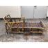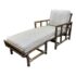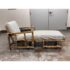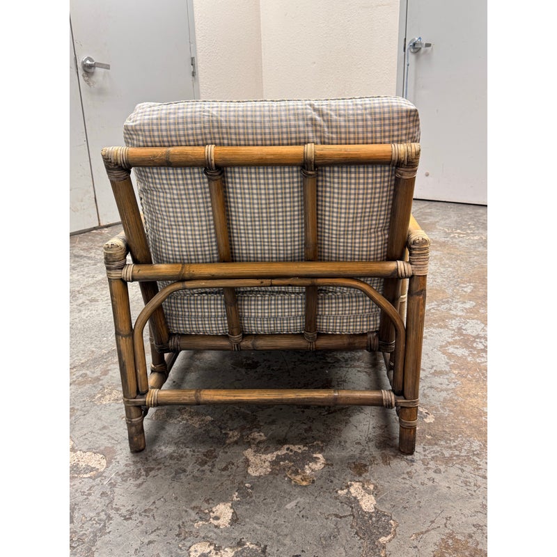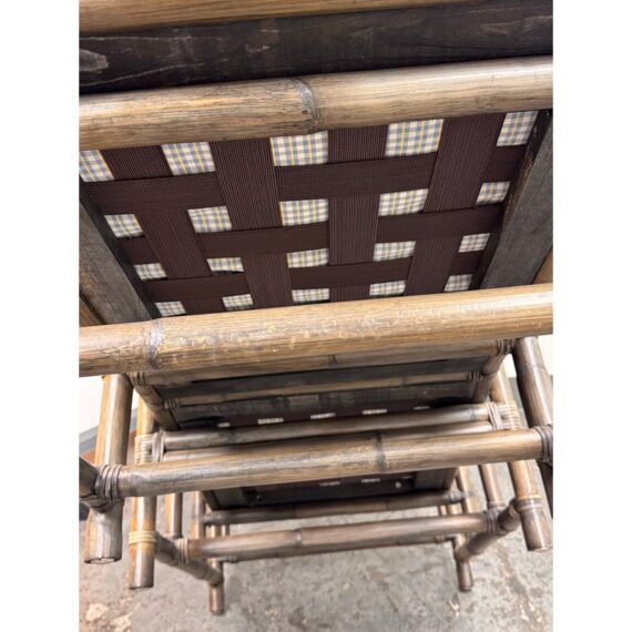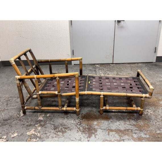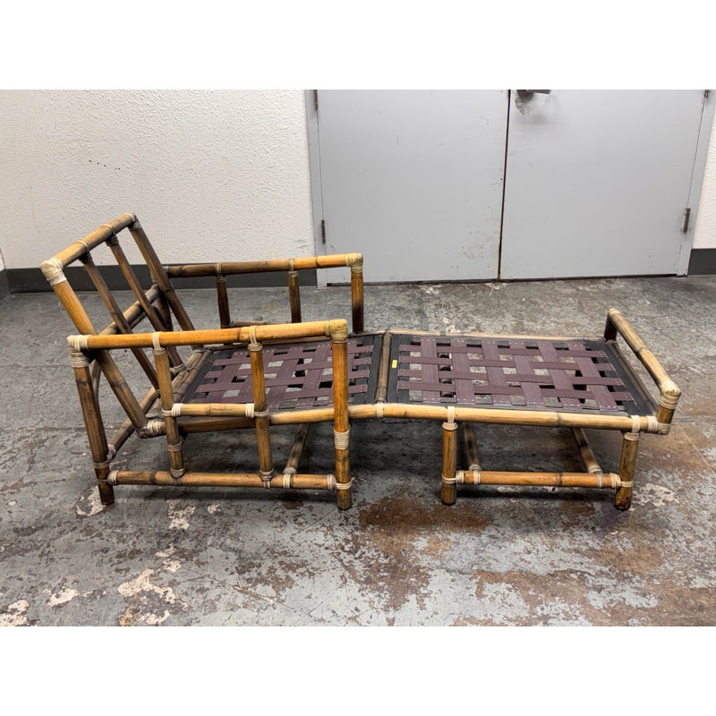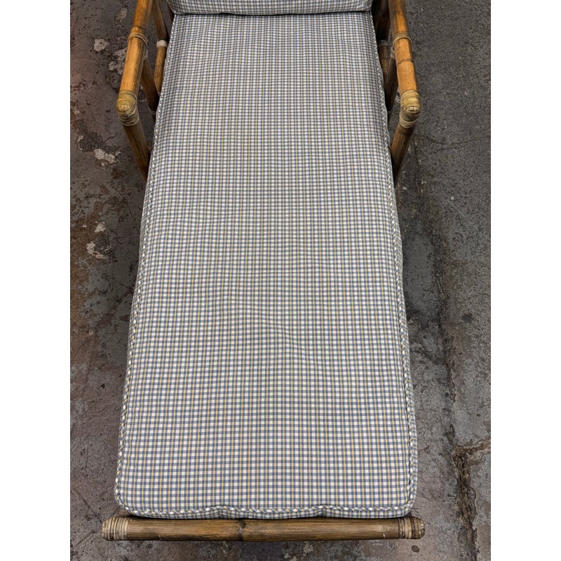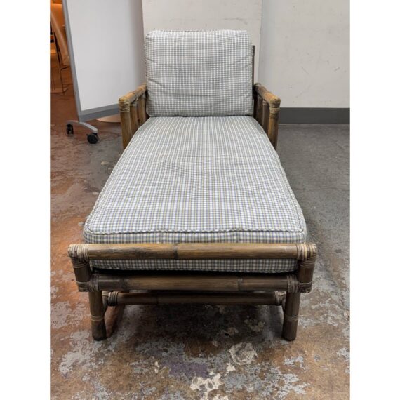 Design Plus Gallery presents a Circa 1970’s Chaise Lounge from McGuire Furniture. This vintage piece showcases the brand’s signature rattan and bamboo frame styling, accented by rawhide lashing at the joints. The structure includes an integrated extended section and a supportive webbed base beneath upholstered cushions. The current cushions are upholstered in a small-scale check pattern fabric and are removable. Brass logo is attached to the frame. This is a discontinued model with the brand and is in good condition with visible and minimal wear from usage. Made in the Philippines.