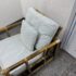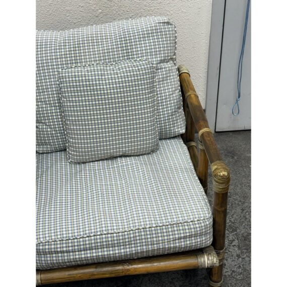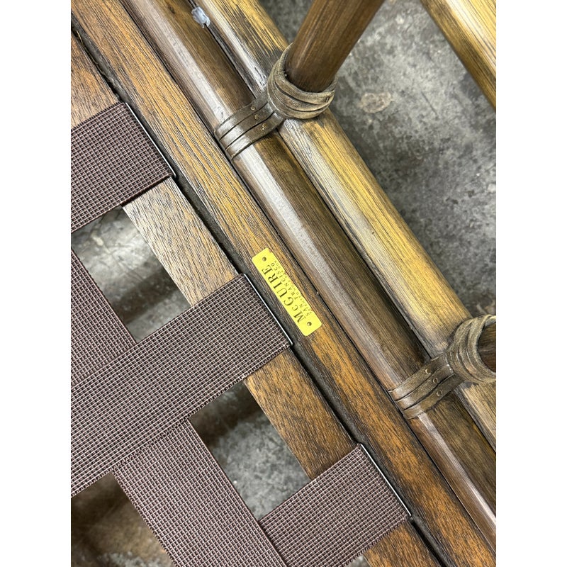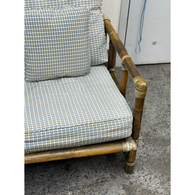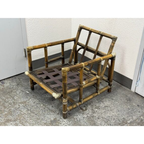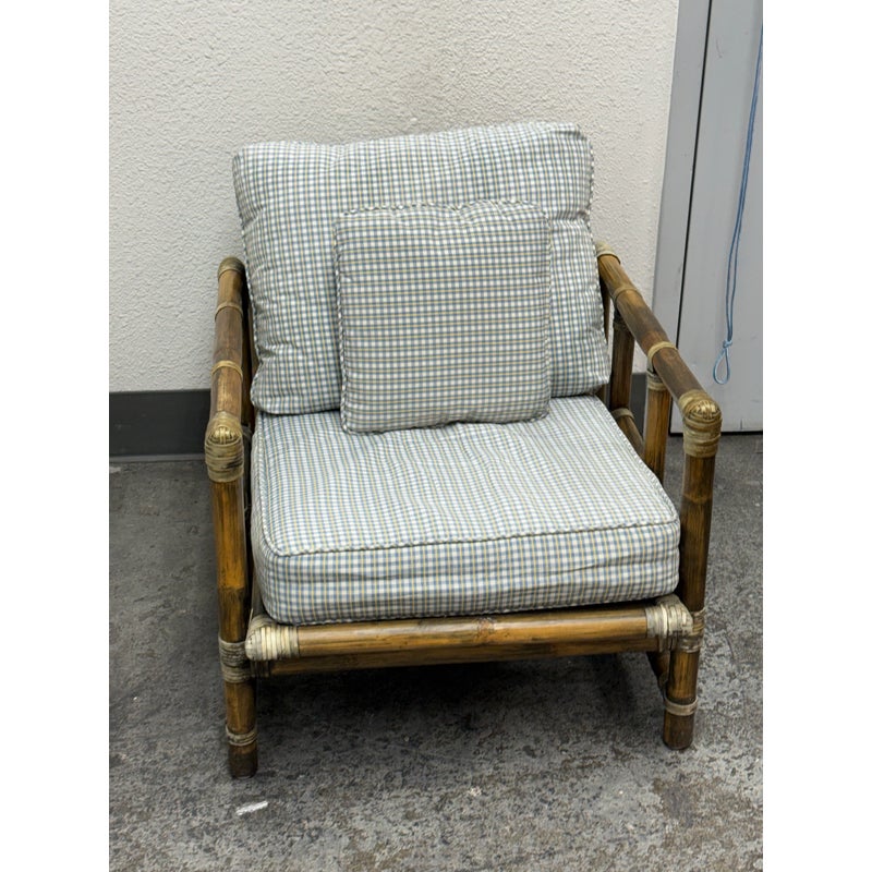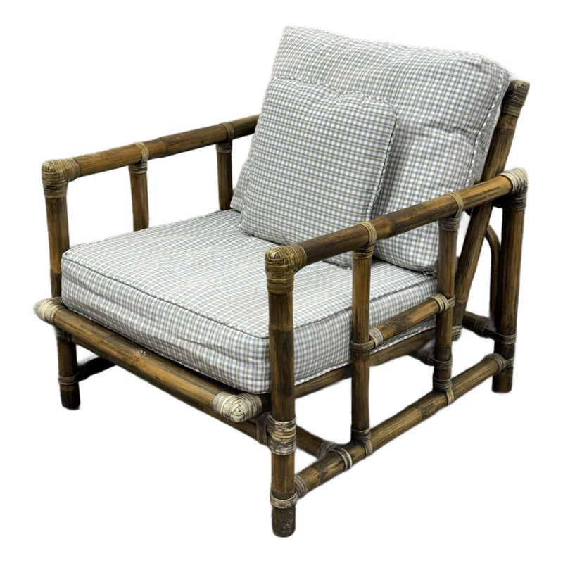 Design Plus Gallery presents a Pair of Bamboo Club Chair from McGuire Furniture. This chair showcases the brand’s signature rattan and bamboo-form construction, joined by tightly wrapped rawhide bindings that highlight the iconic McGuire aesthetic. The structure includes a supportive webbed seat deck and a squared frame with open sides and defined armrests. The chairs are accompanied by loose seat and back cushions along with coordinating lumbar pillows, upholstered in a soft check-pattern fabric that complements the natural tones of the frame. The combination of organic materials and structured form reflects the enduring design language associated with McGuire Furniture during this period. The original brass maker’s tag is present. This is a discontinued model with the brand, is in good condition with visible and minimal wear from usage. Made in the Philippines.