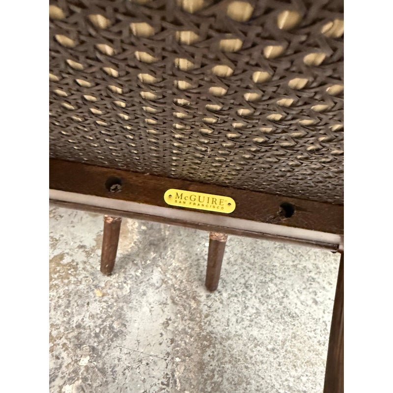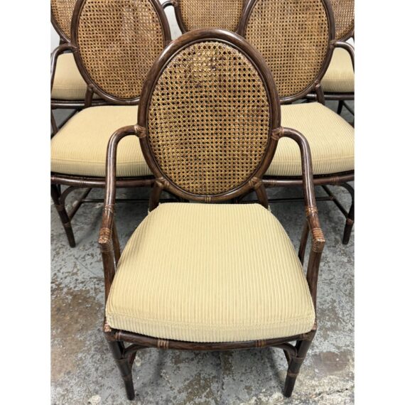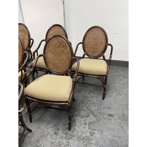 Design Plus Gallery presents a Set of Six Vintage Double Cane Back Dining Armchairs from McGuire Furniture. The chairs have oval cane backs with a bamboo-form frame, curved arms, and upholstered seats in a neutral striped textile. McGuire’s signature rawhide bindings accent the joints and reinforce the organic lines of the design, while the caned backs and slender supports give the set a distinctive vintage profile. The branded plaque beneath the seat confirms the maker, and the overall composition reflects the company’s well-known approach to natural materials and tailored construction. They are in good condition with visible and minimal wear from usage. Made in the Philippines.