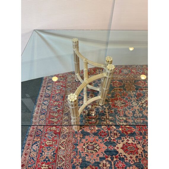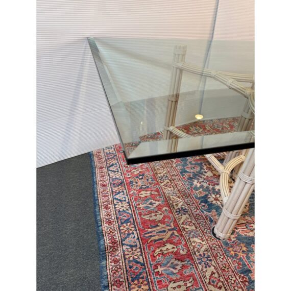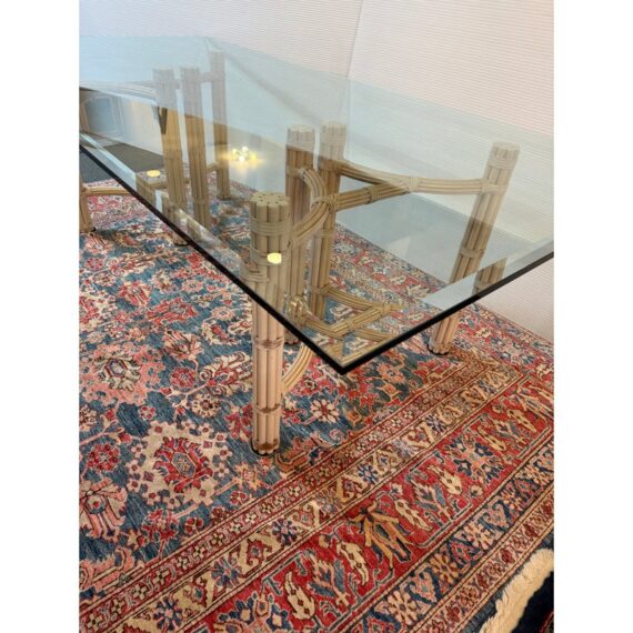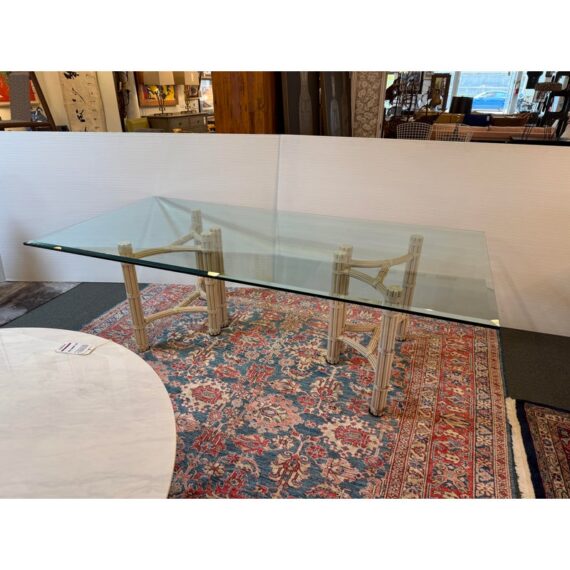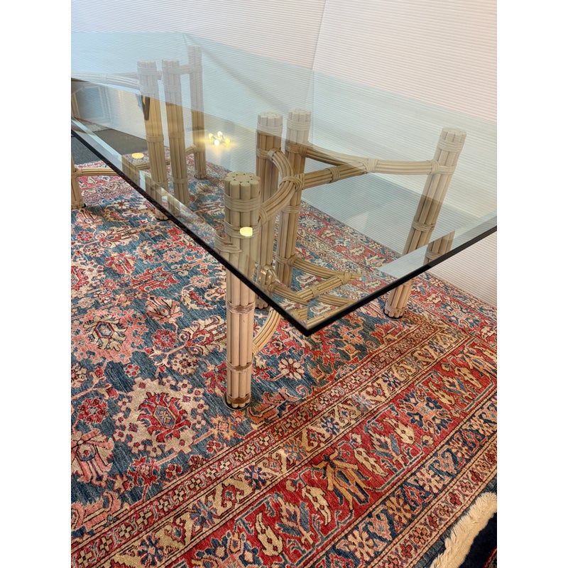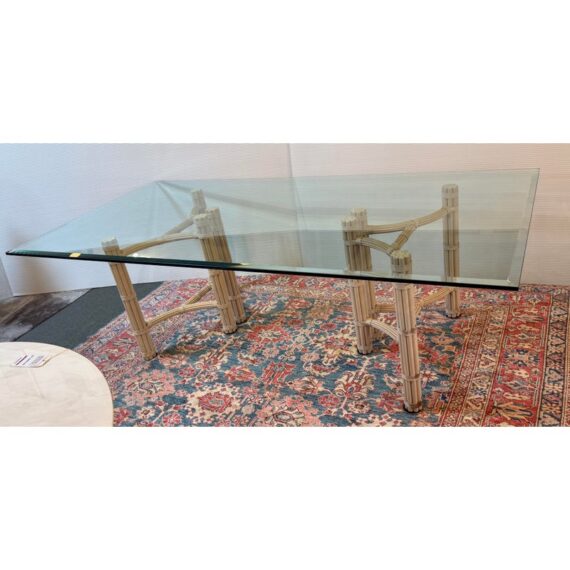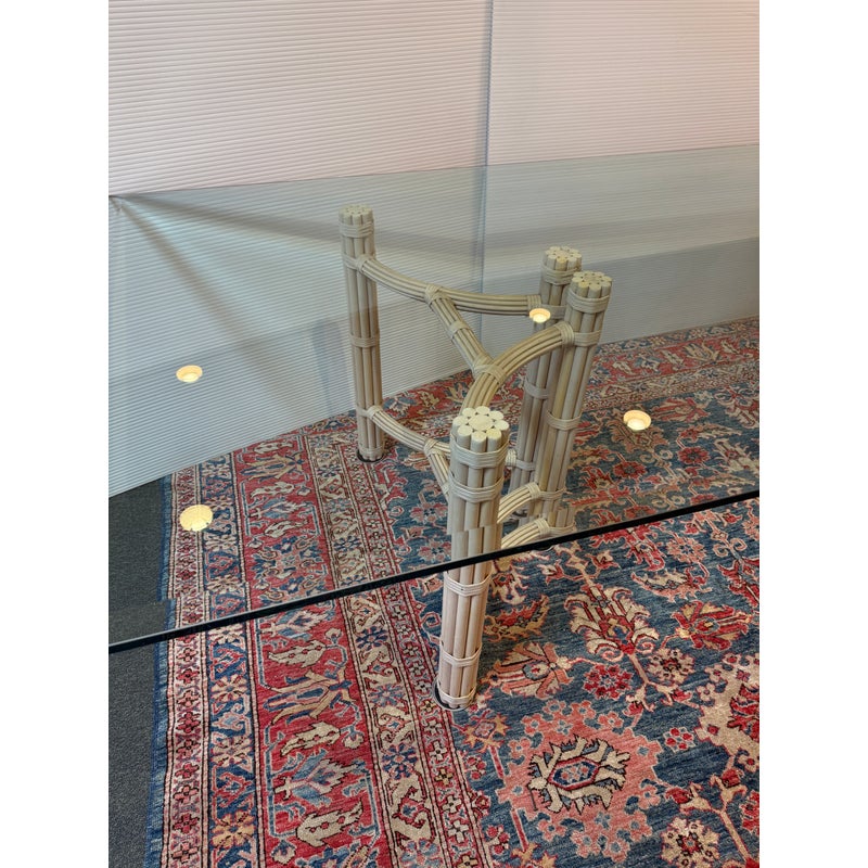 Design Plus Gallery presents a Double Pedestal Dining Table from McGuire Furniture. The beauty of this mid-century table is in its organic nature. The two bases are both geometrically shaped by bamboo rods that are tied together with leather straps. The bases have a light, off-white tone making this table seem minimalist and visually light. A large, beveled edge rectangular glass tabletop that is crystal clear pairs with the bases. The surface allows for you to fully appreciate the design that McGuire was well-known for. The table is in good vintage condition with wear that is consistent with usage. Made in the USA.