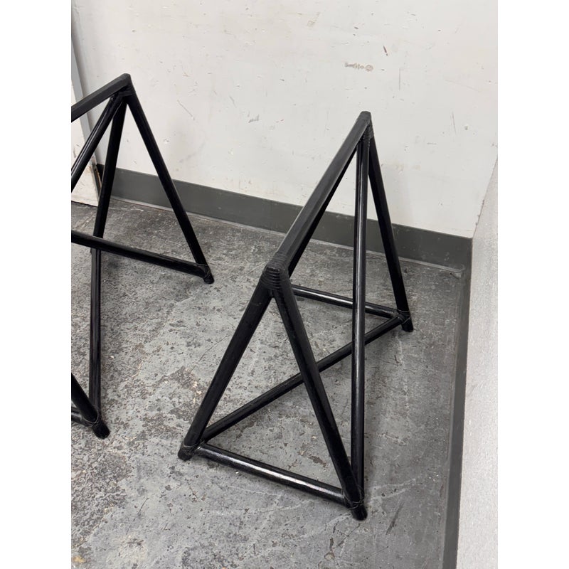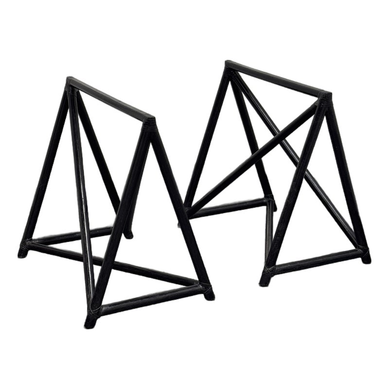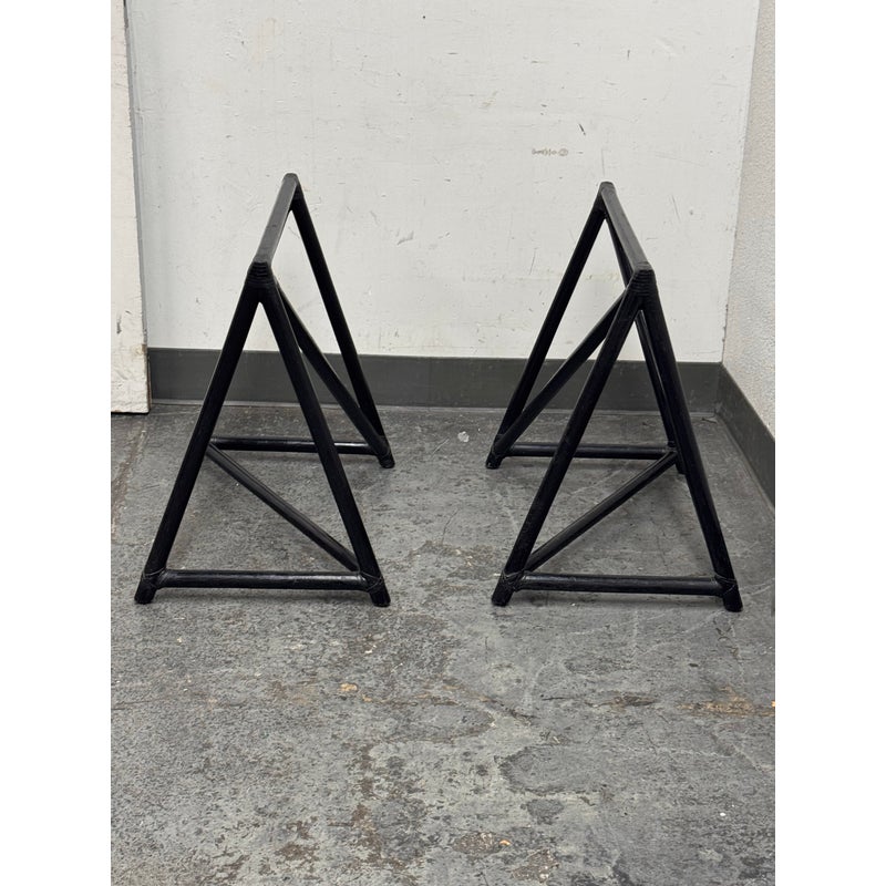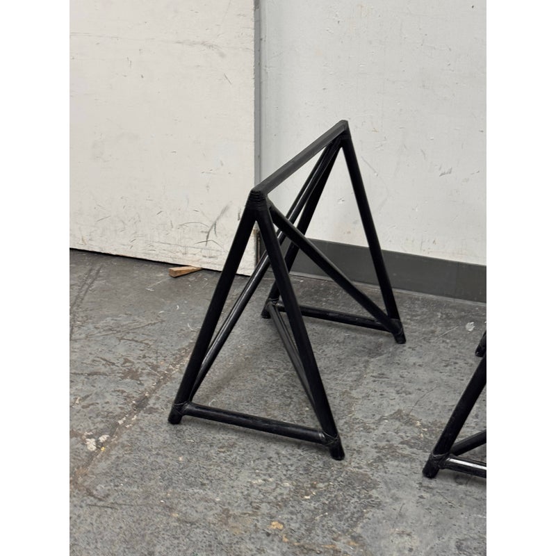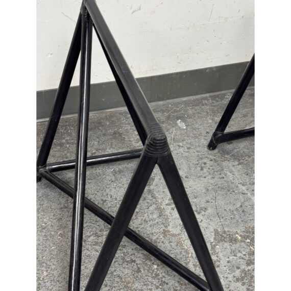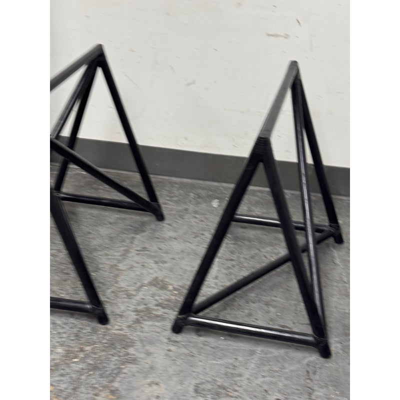 Design Plus Gallery presents a Pair of Hawkins Sawhorse Bases by McGuire Furniture. The bases have rich dark leather wrapping around bamboo supports that are stained black. These bases will offer you efficient and elegant support when a rectangular expanse of glass is added. They are in good condition with visible and minimal wear from usage. Made in the USA.