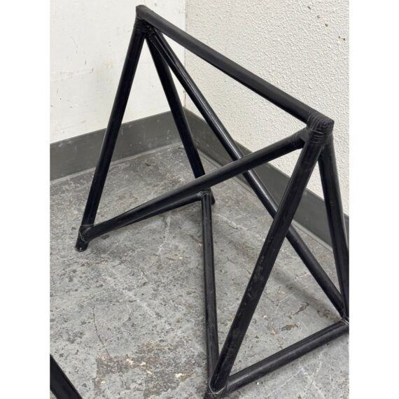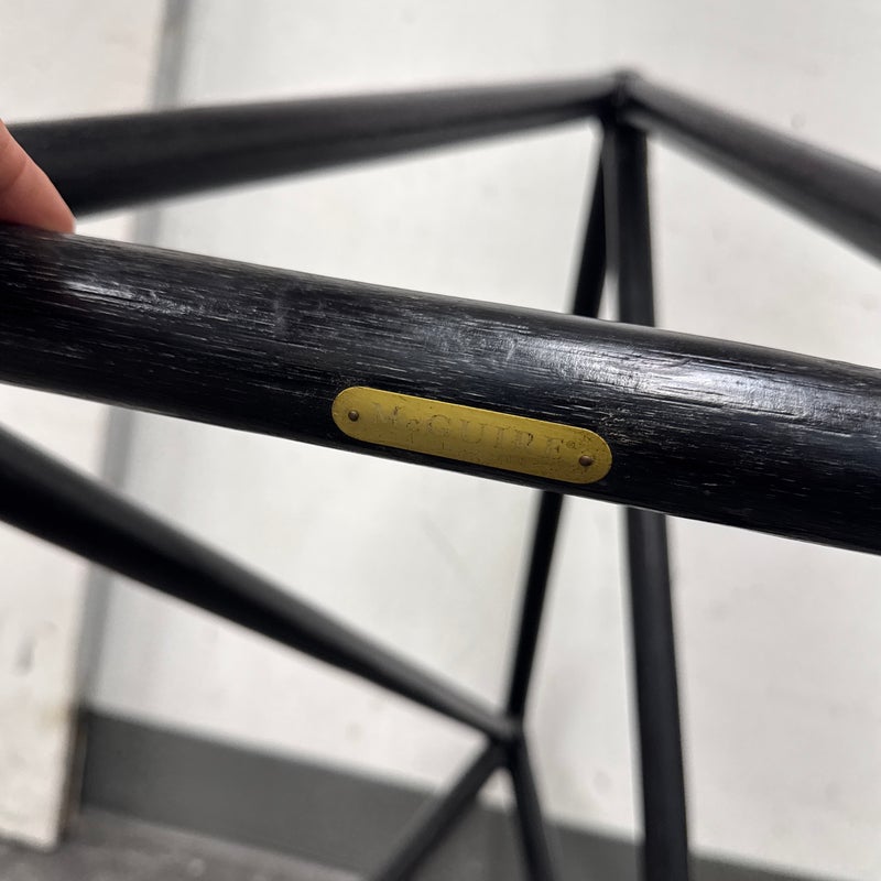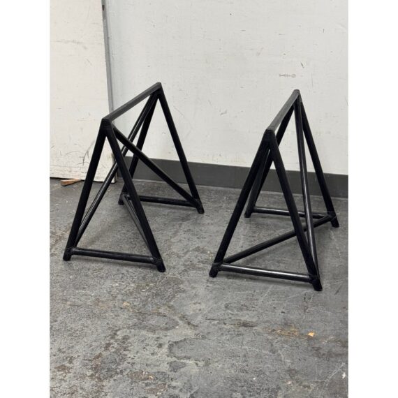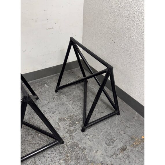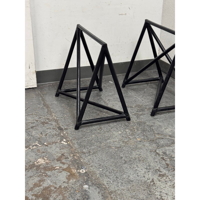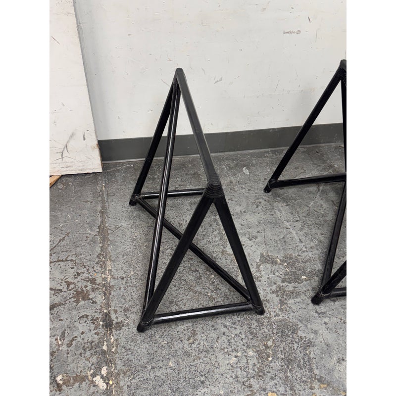 Design Plus Gallery presents a Pair of Hawkins Sawhorse Bases by McGuire Furniture. The bases have rich dark leather wrapping around bamboo supports that are stained black. These bases will offer you efficient and elegant support when a rectangular expanse of glass is added. They are in good condition with visible and minimal wear from usage. Made in the USA.