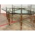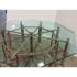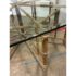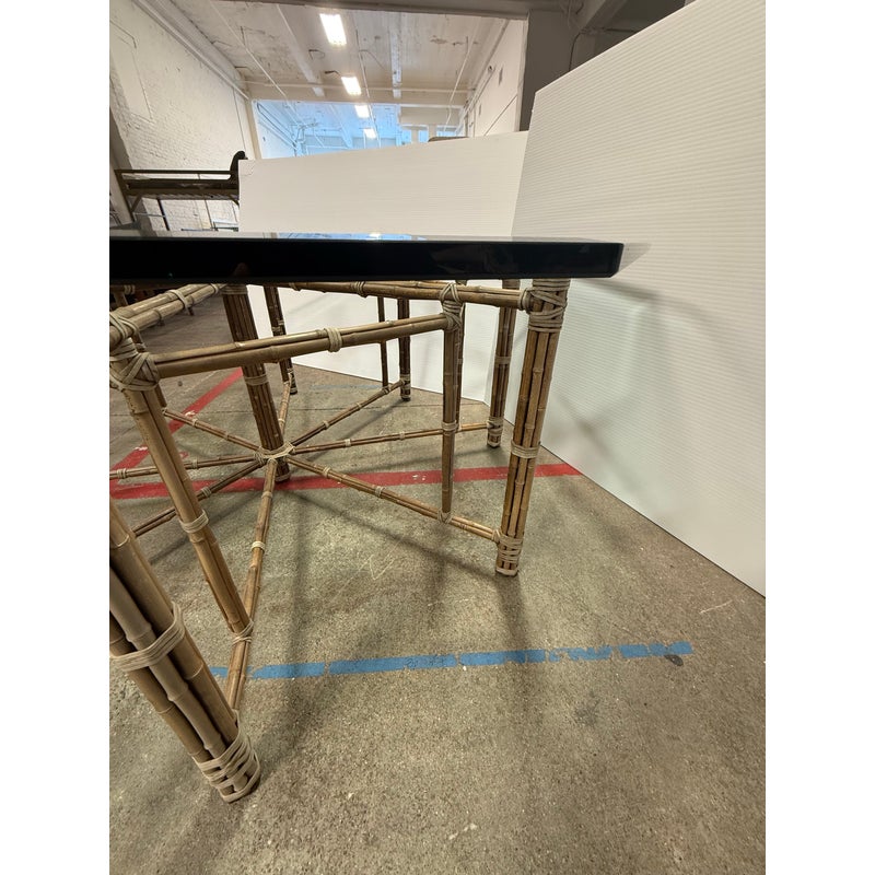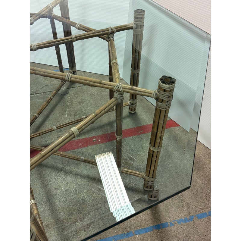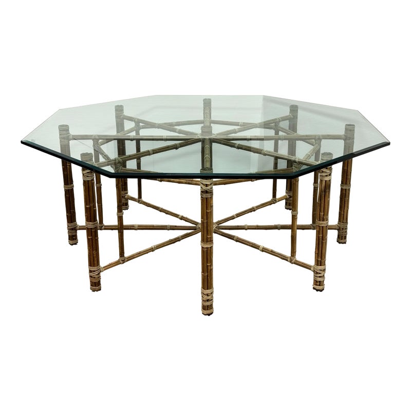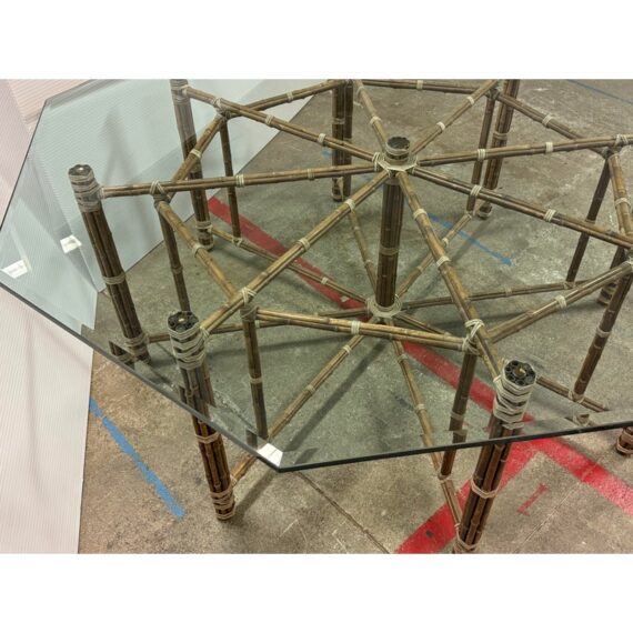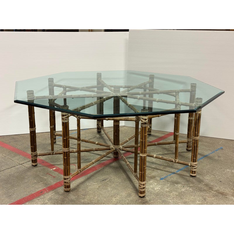 Design Plus Gallery presents a Late 20th Century Octagonal Dining Table from McGuire Furniture. The table is showcases the brand’s use of natural materials as the sculptured base is constructed from bamboo poles arranged in a geometric configuration and secured with McGuire’s signature rawhide lacing. The octagon-shaped glass top with a beveled edge rests above the base that allows full visibility of the detailed bamboo structure beneath. This McGuire dining table balances visual interest with everyday functionality and enduring design appeal. In good condition, visible and minimal wear from usage. Made in the Philippines.