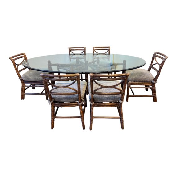 Design Plus Gallery presents a Bamboo Rattan Dining Table + Six Chairs Set by McGuire Furniture. The table features a large elongated hexagonal star shaped base topped with a very thick pane of McGuire oval glass with a thick beveled border. The geometric base has an iron frame wrapped with bamboo poles lashed together with leather rawhide laces. The bamboo has a beautifully aged patina from exposure. Chairs offer the same bamboo finish with leather straps for a harmonious atheistic. Rare seat back design style for the brand, with a dual semi-circle seat back. Each side chair has a tie-back plush seat cushion in a neutral tan tone. All items are in good vintage collection, with wear that is consistent with their age + use.