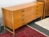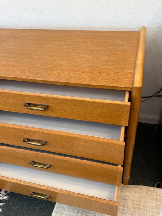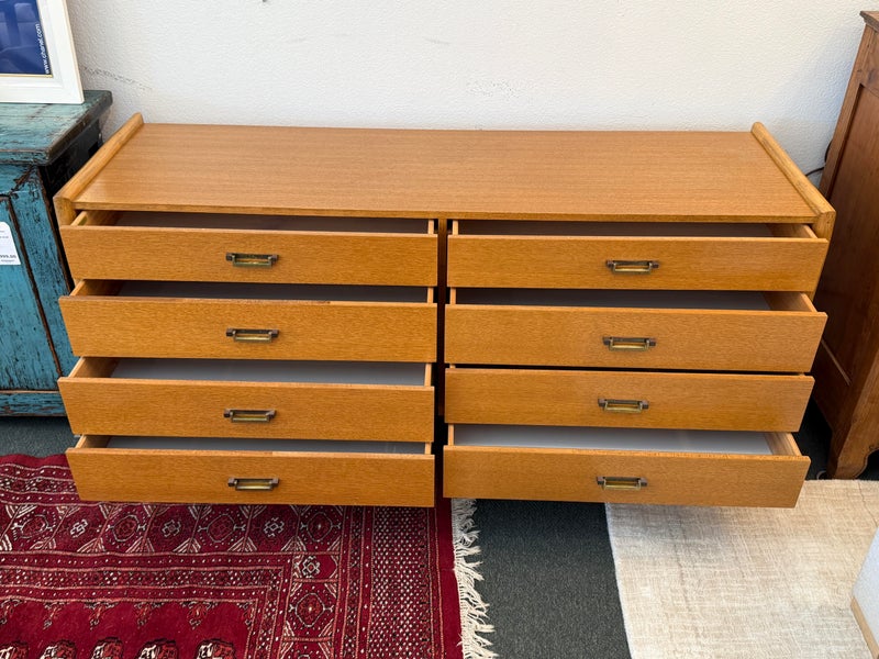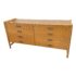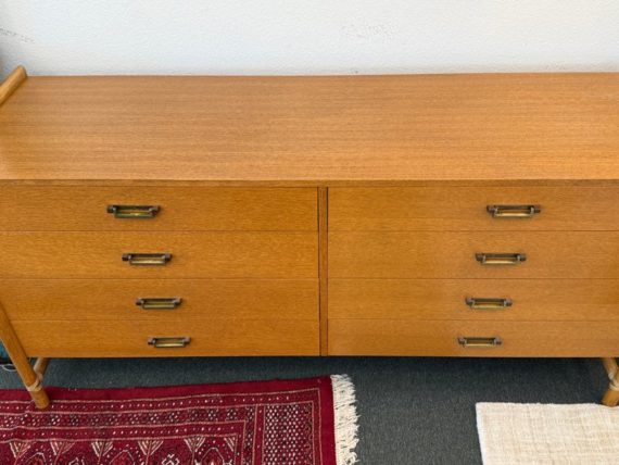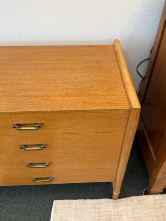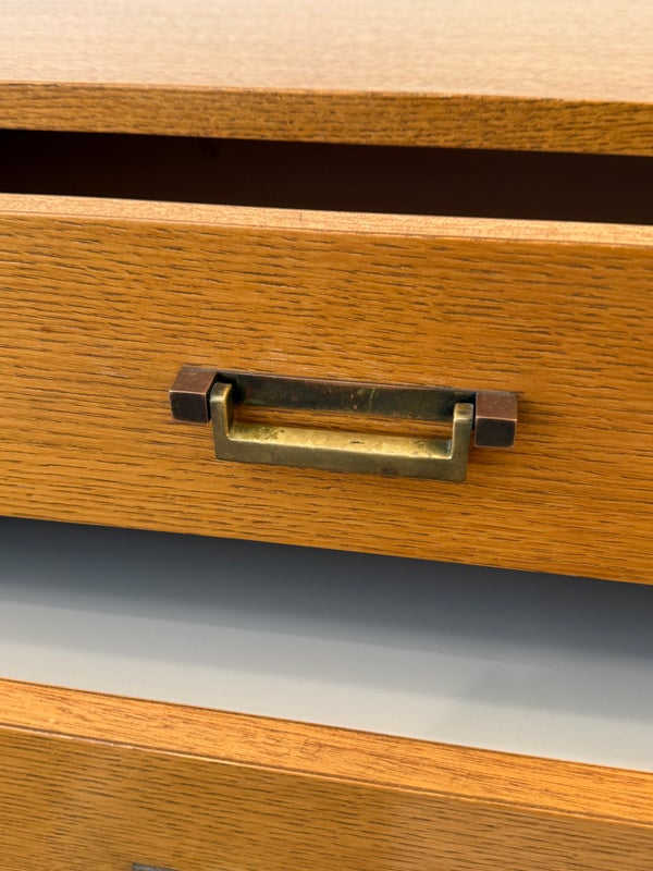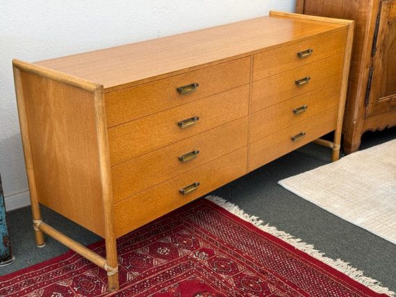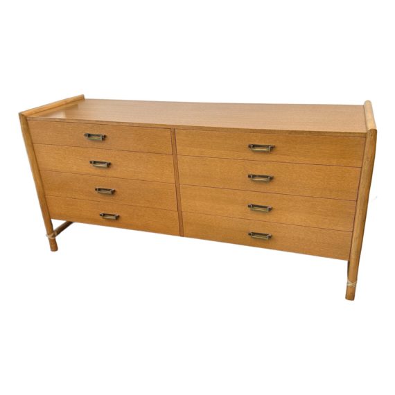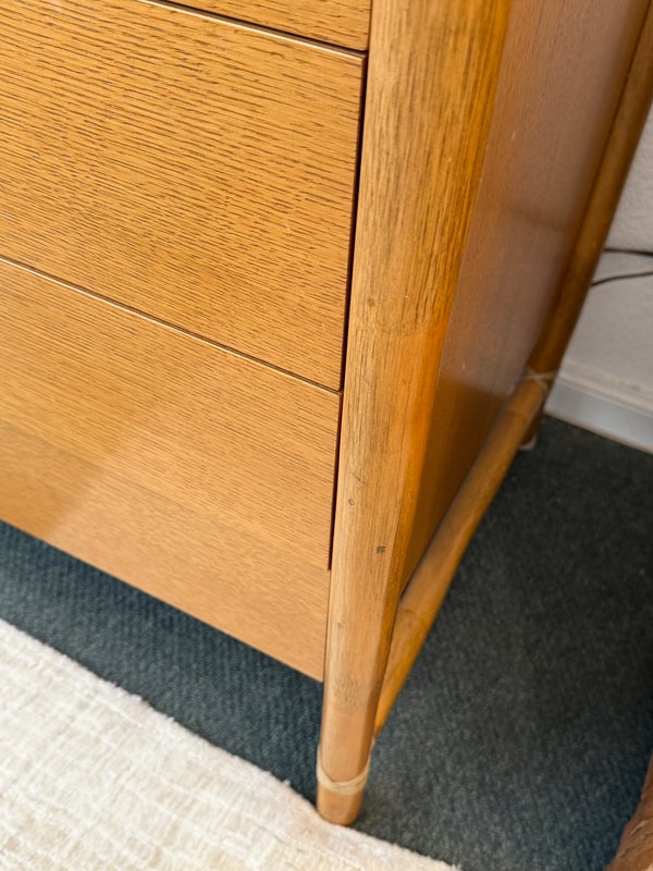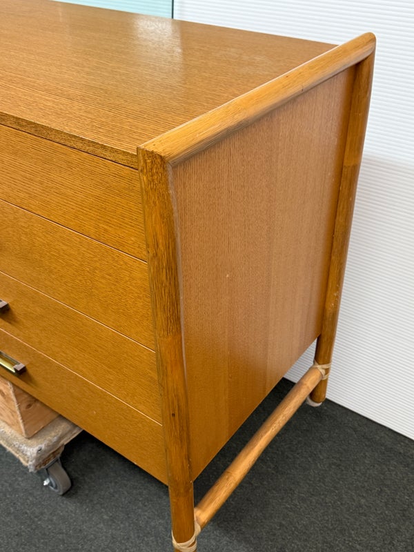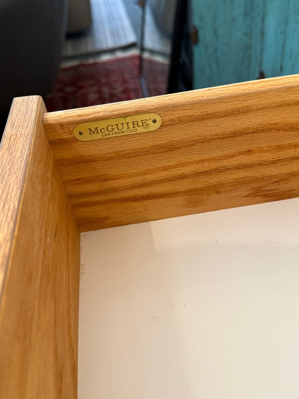 Design Plus Gallery presents a Vintage Campaign Style Dresser by McGuire, Circa 1970’s. Clean lined oak construction has with side mounted bamboo legs detailed with iconic leather wraps. Original solid brass pulls, light patinas, finish this always-contemporary dresser. Retains the Makers mark. Light surface wear; nicks and marks on feet; condition is good for age and use.