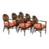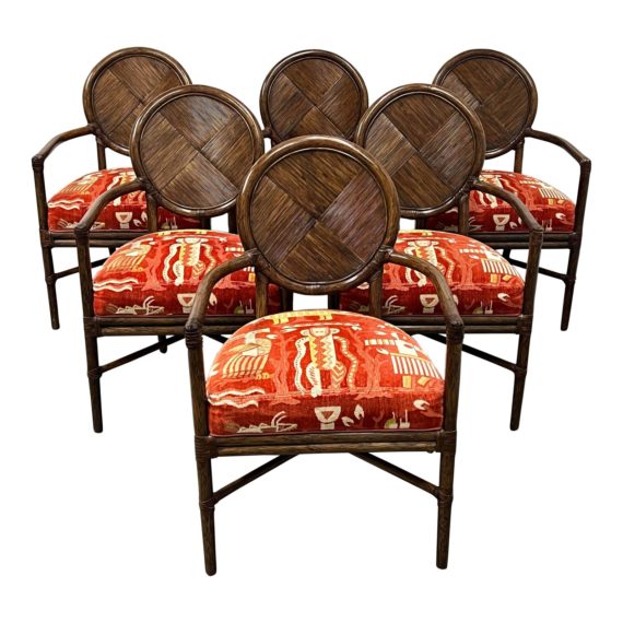 Design Plus Gallery presents a Set of Six McGuire Dining Room Arm Chairs with Unique Tribal Upholstery. The fabric has unique imagery of animal prints like bird, monkeys and big cats in a distinctive red velvet with gold + cream, accent colors. The chairs are beautifully constructed of rattan accented with raw hide leather straps, with the Mcguire brass signature plate on each individual arm chair. The seat back also features a distinct + unusual rounded back with diamond like woven insert. These chairs are an absolute treat for any McGuire collectior. Visible and minor wear, some seat conditions on the fabric. Scratches on the backing + leather wraps.