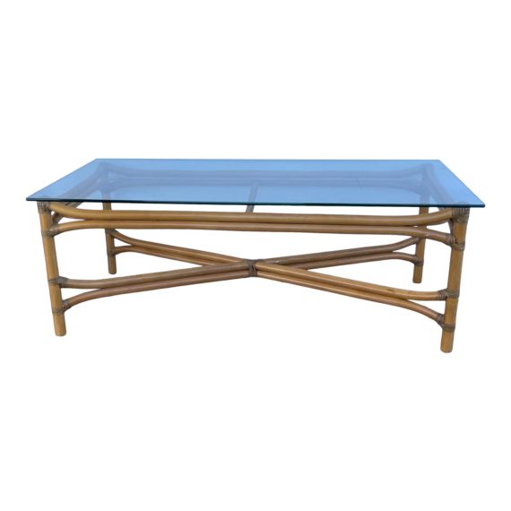 Design Plus Gallery presents a McGuire style coffee table. Beautiful bamboo rods are lashed together with McGuire’s signature raw hide lacing in an intricate pattern. Three bamboo rods connect in a central point to enforce stability. The top is a regular-edge rectangle shape glass that sits atop the base. Perfect for mornings involving coffee and a good book.