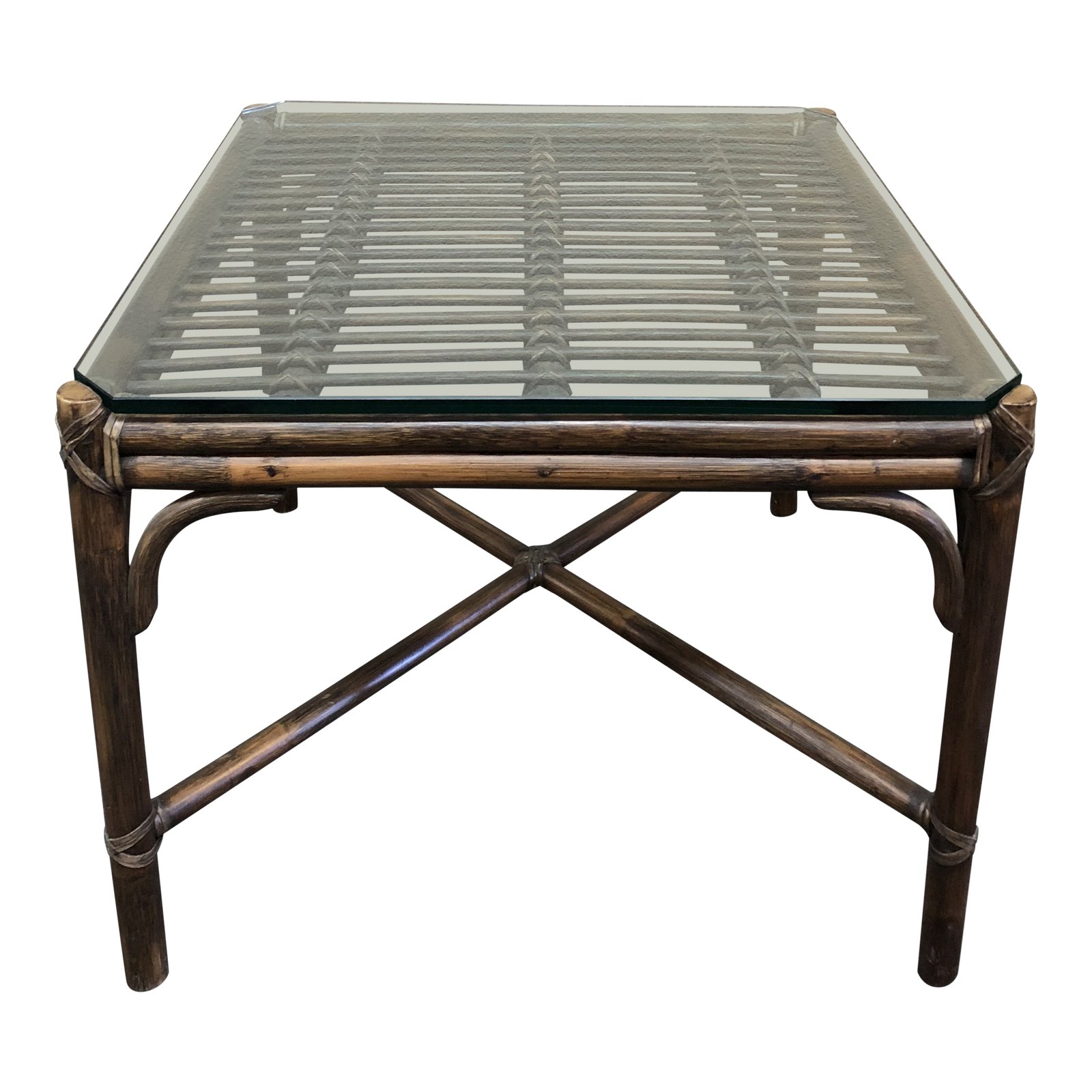 Design Plus Gallery presents a Vintage Accent Table by McGuire. Classic leather wrapped bamboo in tobacco finish, the glass top table lets the bamboo be the star.