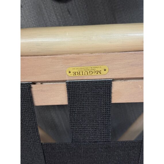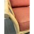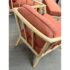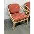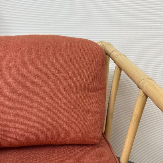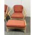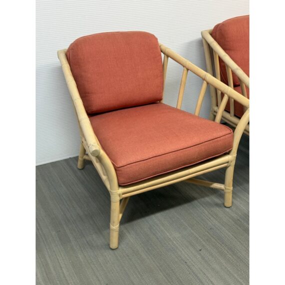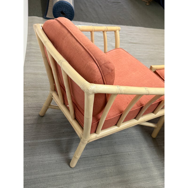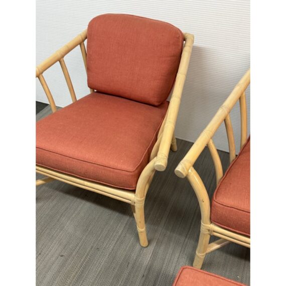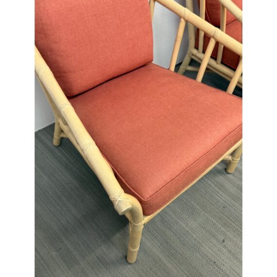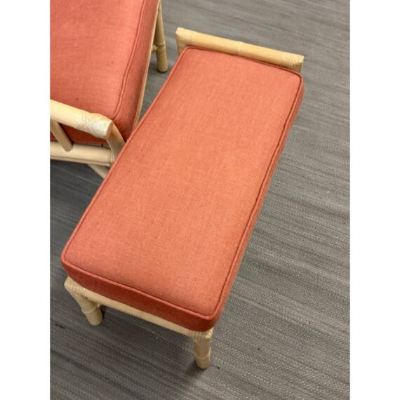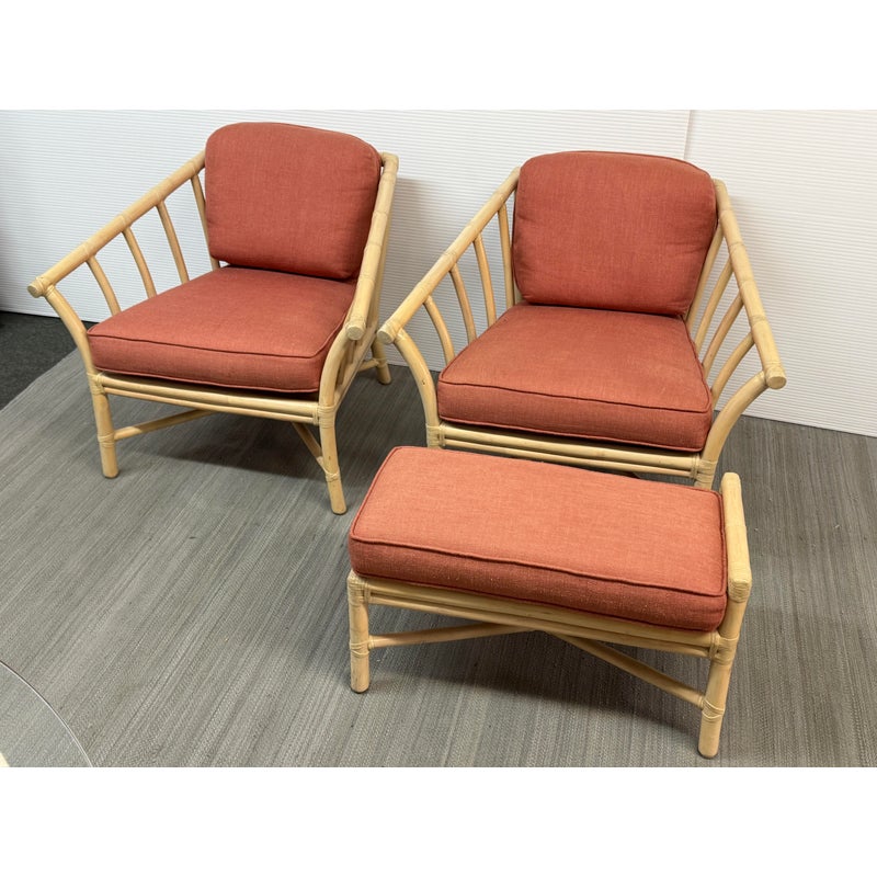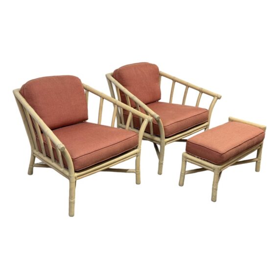 Design Plus Gallery presents a Pair of Armchairs + Ottoman from McGuire Furniture. The pair of chairs offer their silhouette to be made with the use of shaping, bending rattan and securing them with leather wraps at numerous joints. The frame is in a white washed bone tone, unique for the brand. The ottoman has a single loose persimmon cushion with the two chairs offering a back and seat back cushion in the same tone for maximum comfort and style. Light surface wear to the frame and condition is good for their vintage age and use.