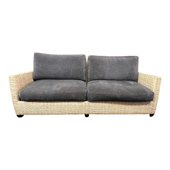 Design Plus Gallery presents a Vintage McGuire Sofa. A classic silhouette allows this woven split bamboo design to remain current. A refresh of upholstery to foam-filled cushion swill create stylish comfort. Light surface wear and sun damage evident.