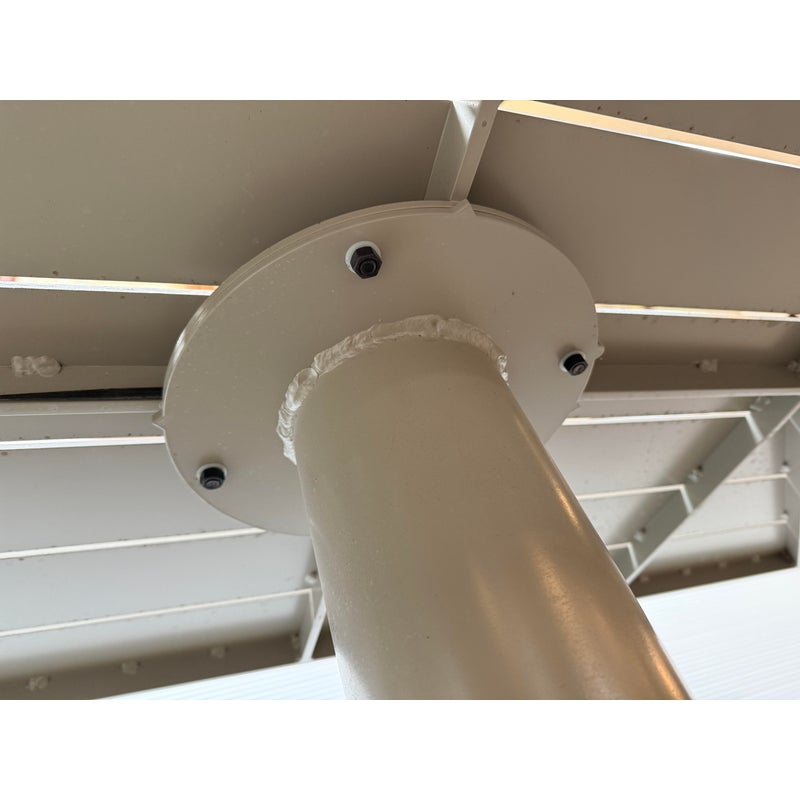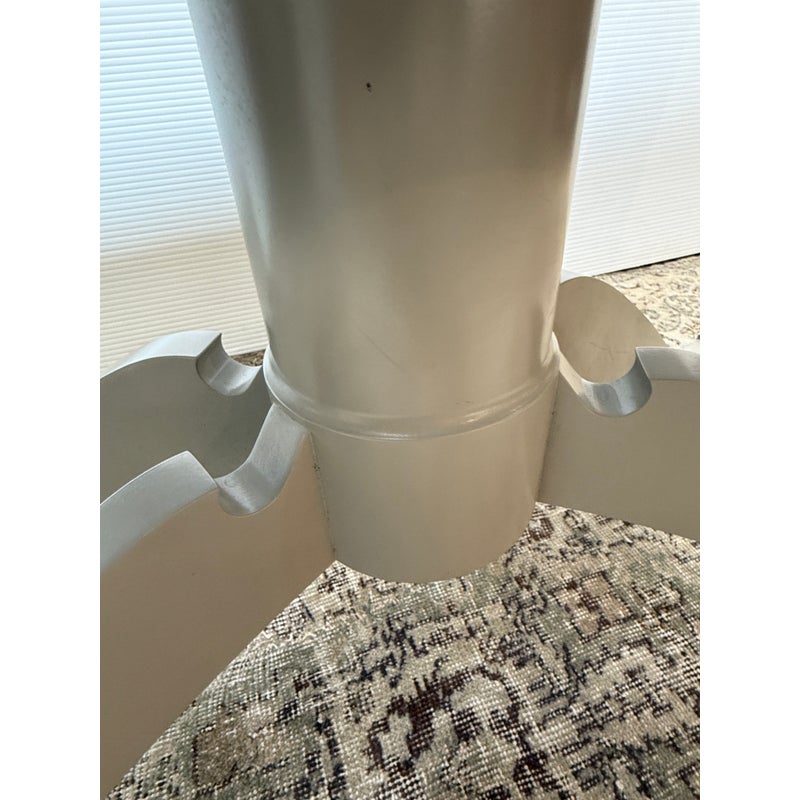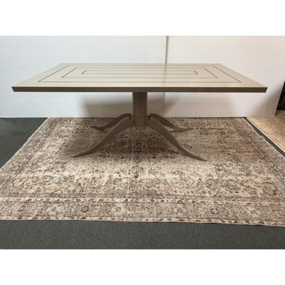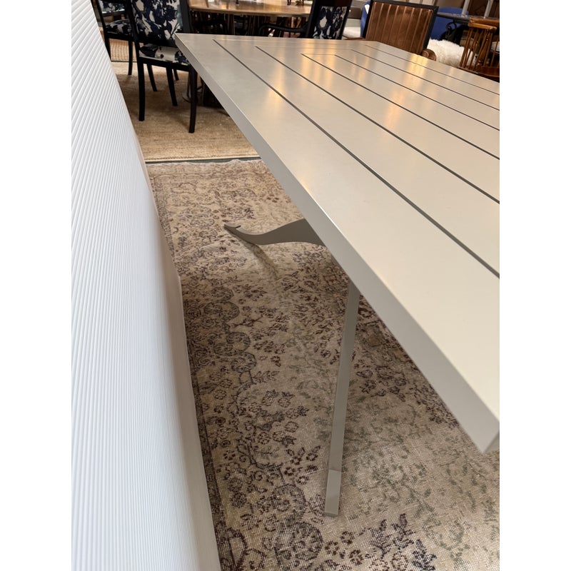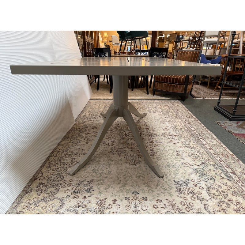 Design Plus Gallery presents the Outdoor Lipscomb Dining Table Base with Adams Style Top by McKinnon & Harris. The table is done in their Seven River Stone finish and has been custom to order for previous owner. Their talented team of artisans and designers has been handcrafting customized, made-to-order furniture at our Richmond, VA workshop for over 30 years. The tailored base of ultra heavy aluminum, shaped like a ship binnacle, is hand fit with solid aluminum legs. The rectangular top is perforated with a sequence of undulating slats for a visually appealing design. It is in good overall condition with wear that is consistent with usage.