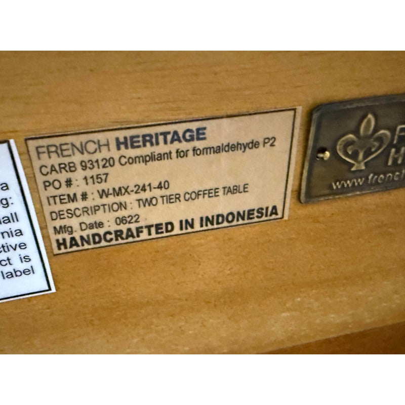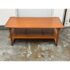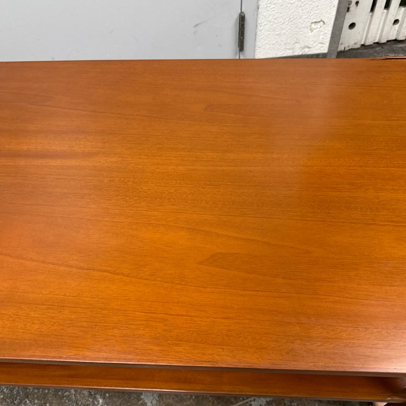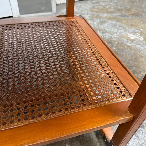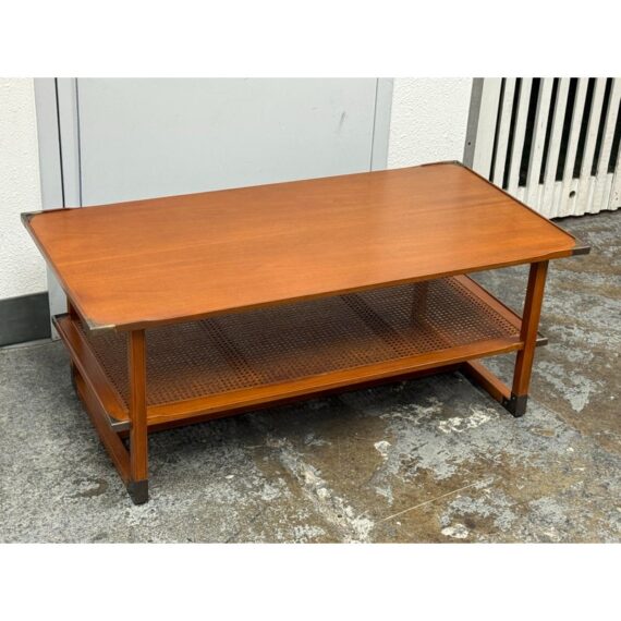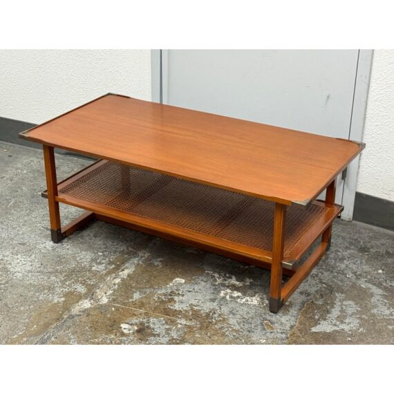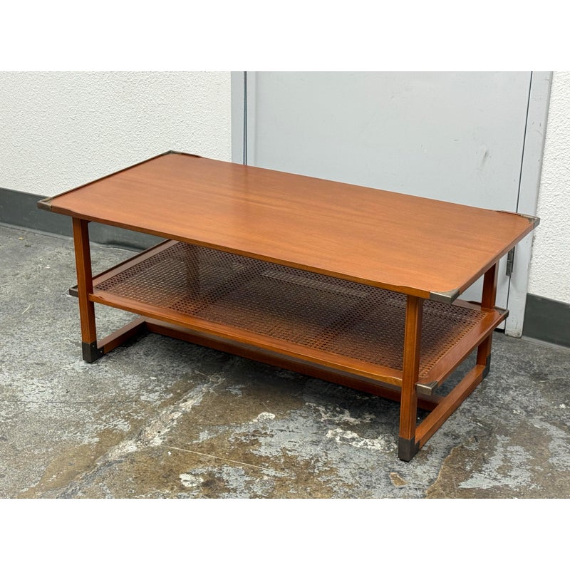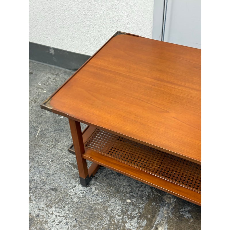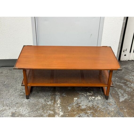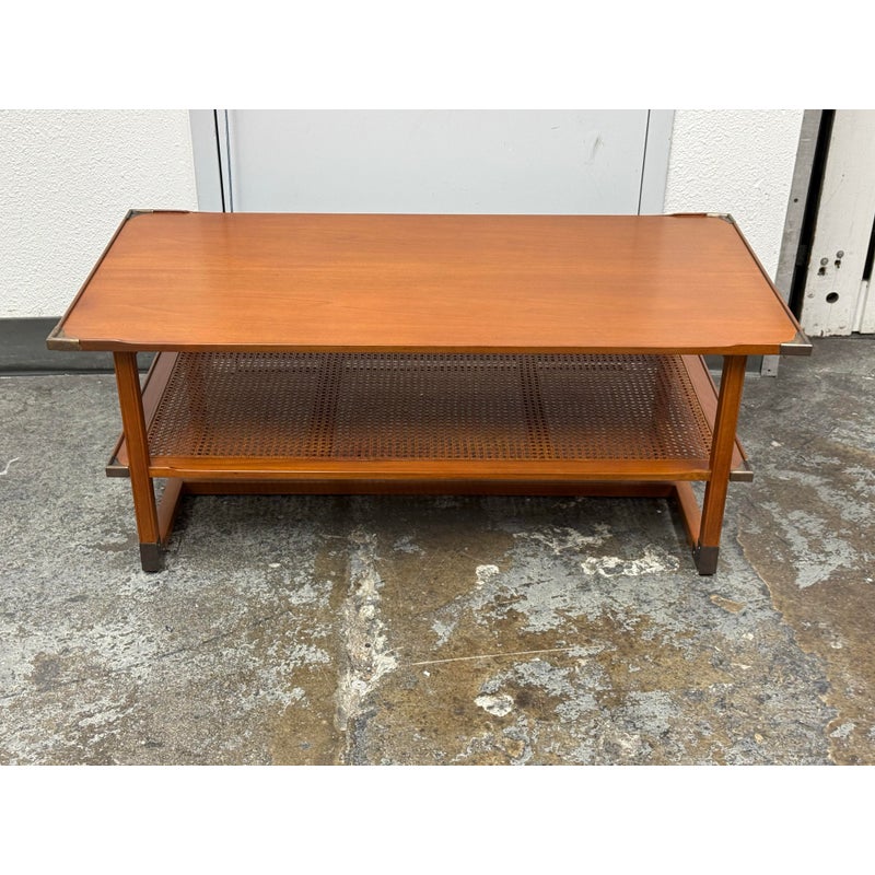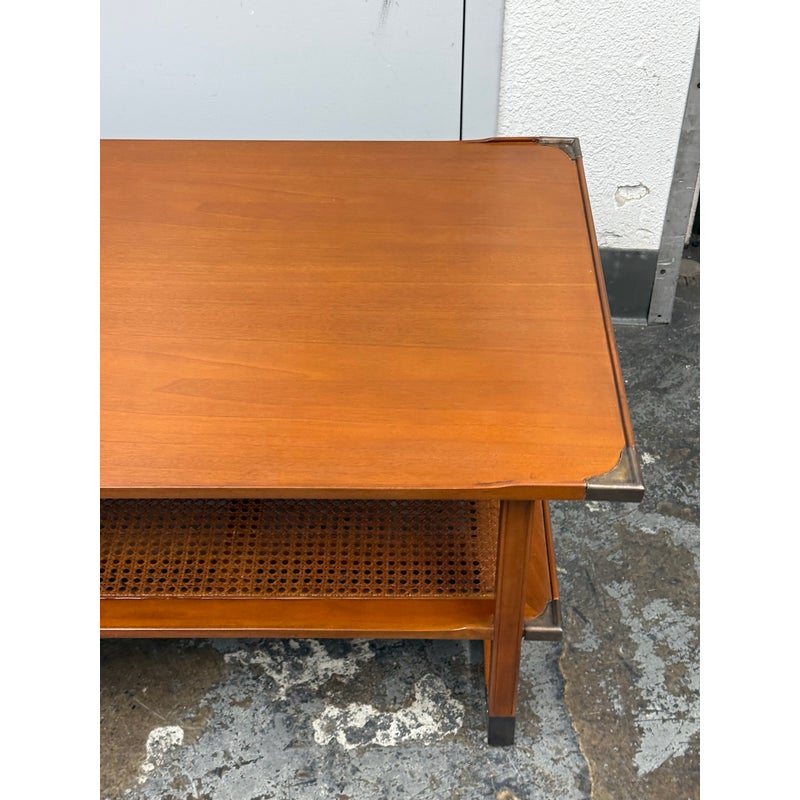 Design Plus Gallery present the Caned Shelf Coffee Table from MeCox Garden Collection. The Garden Collection is their exclusive furniture line incorporating rope, bamboo, rattan and raffia into their broadening array of styles and materials. The dual tiered coffee table is made from solid plantation mahogany with the use of brass endocarps on the base corner edges. The lower shelf is made with the use of cane or the outer layer, or bark, of the rattan plant. This material is peeled and woven to create the distinctive mesh-like patterns and is known for its flexibility, durability, and lightweight nature. The table is in good condition. Made in the Indonesia.