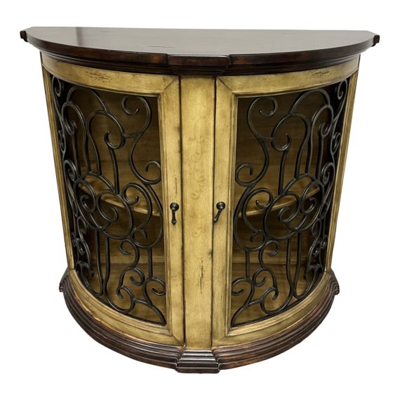 Design Plus Gallery presents a Mediterranean Style Demi-Lune Console Cabinet. The cabinet doors emulate the wrought iron of a garden gate or Italian Villa. There is a fixed shelf inside. The top is painted a rich and deep umber. The base is distressed with a cream paint. There is minor wear through out, demi-lune is in good condition. Made in China.