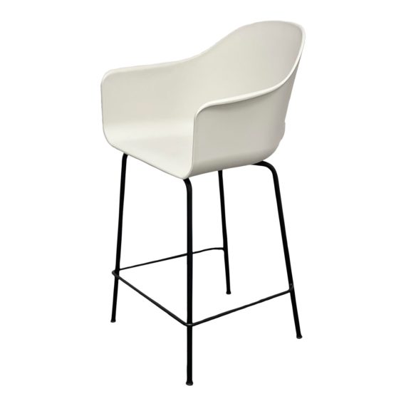 Design Plus Gallery presents a Norm Architects Harbour White Counter Stool by Menu. The slender and sculptural geometric bases are designed with a comfy crossbar for the feet at just the right height to prolong comfort and keep your posture in top form. The bases is in a black powder coated steel. The shell starting is in a White Harbour. This is a Showroom Sample, minor wear from usage. Made in Denmark.