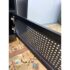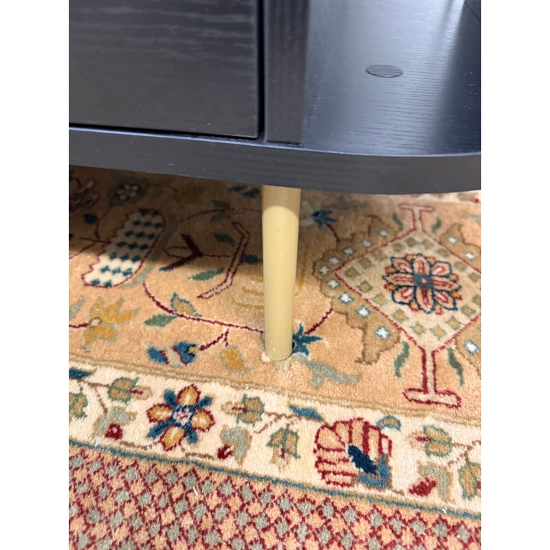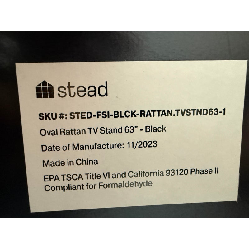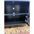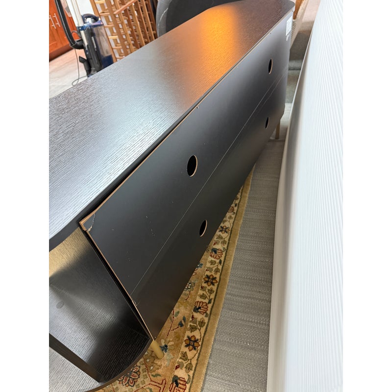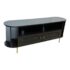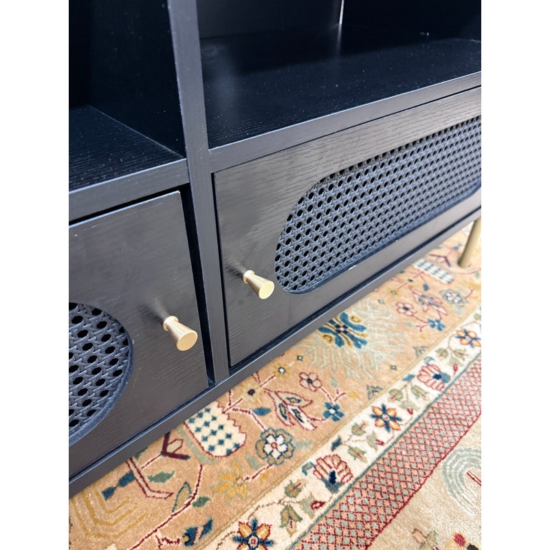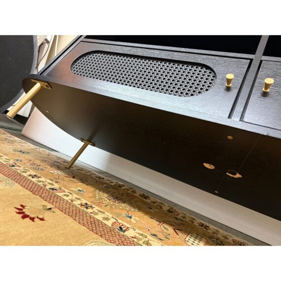Design Plus Gallery presents the Yonael Storage Credenza by Mercer 41. This stylish TV stand makes the perfect addition to your home while making your entertainment room look and feel organized. It features rattan doors with metal knobs with soft-close door hinges. There are two cord cutouts in the back to organize and manage loose cables and wires. Its unique oval shape with round edges, open top, and tall side shelves is a desirable look for mid-century, contemporary and/or boho styles. The unit is no longer produced in the black tone and is in good condition for its usage, with one missing center leg for stability.