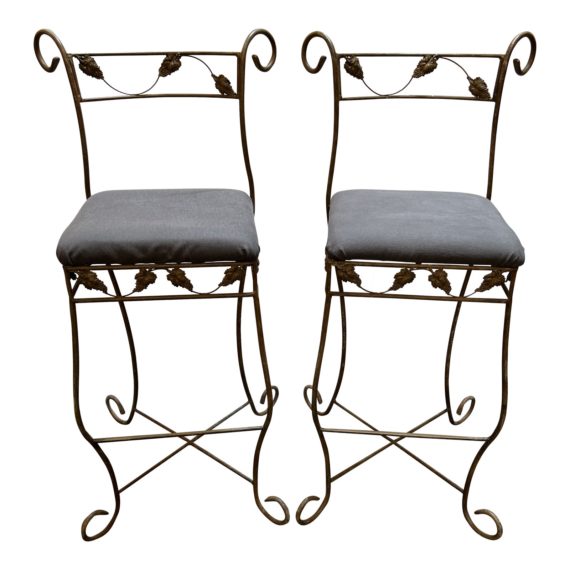 Design Plus Gallery presents a Pair of Bazada Barstools. The metal frames are in a rust copper finish. Suitable for indoors and outdoors. The frames have a grapevine motif around the seat and back trimming. Seat are upholstered in a dark gray fabric. Seats can be easily recovered. Visible and minor wear from usage. Originally purchased from Carmel, California, USA.