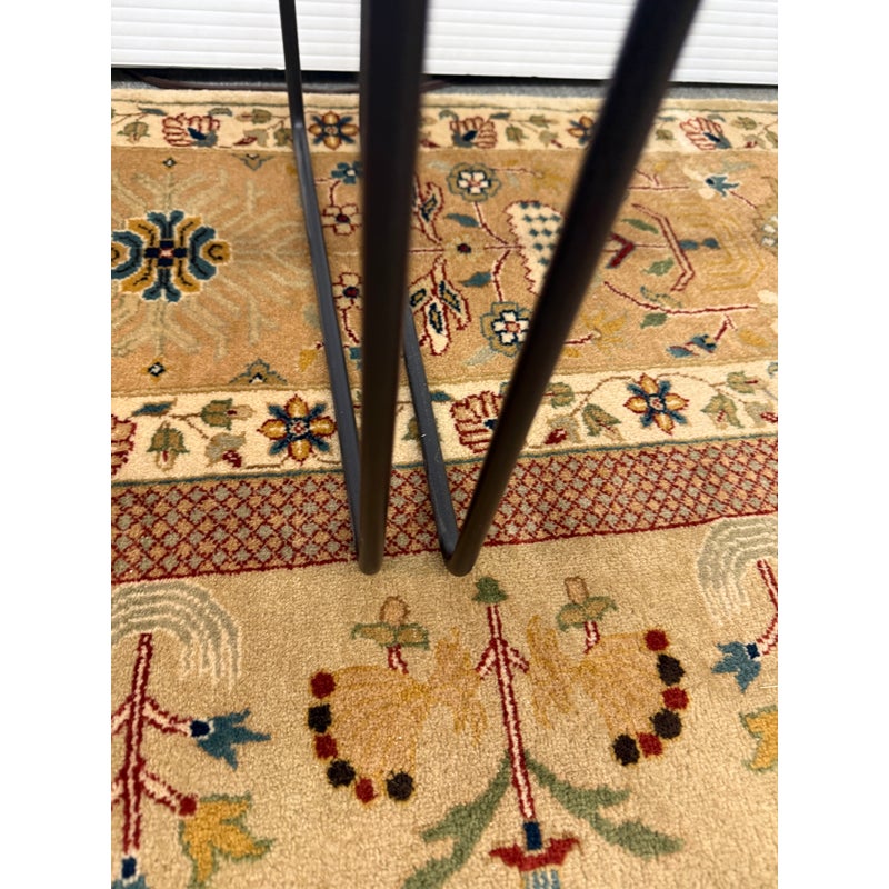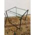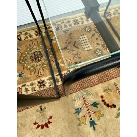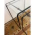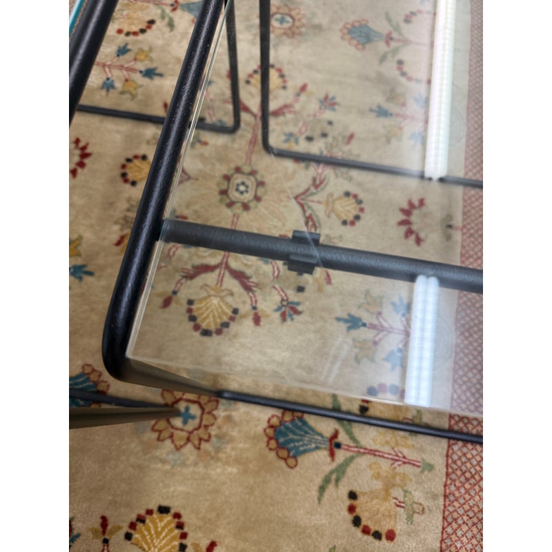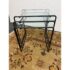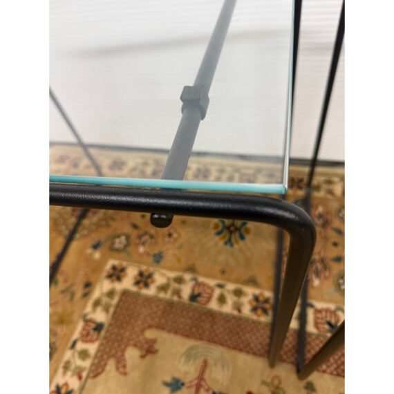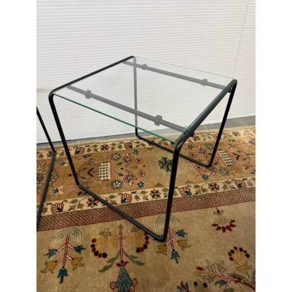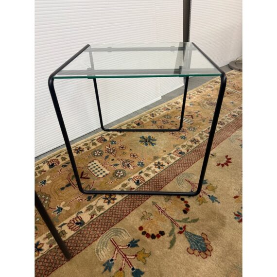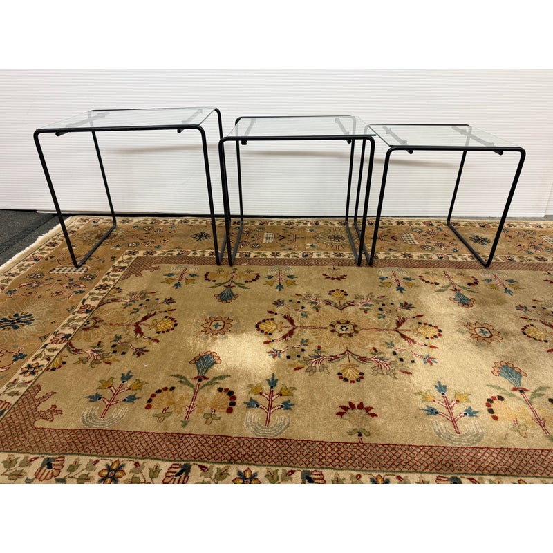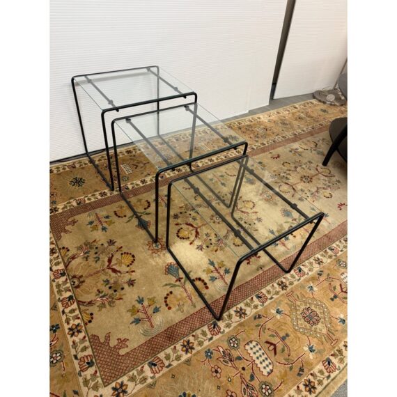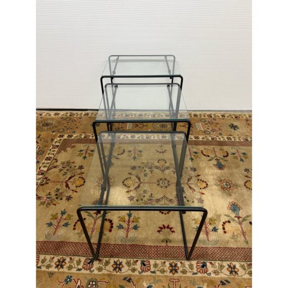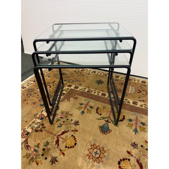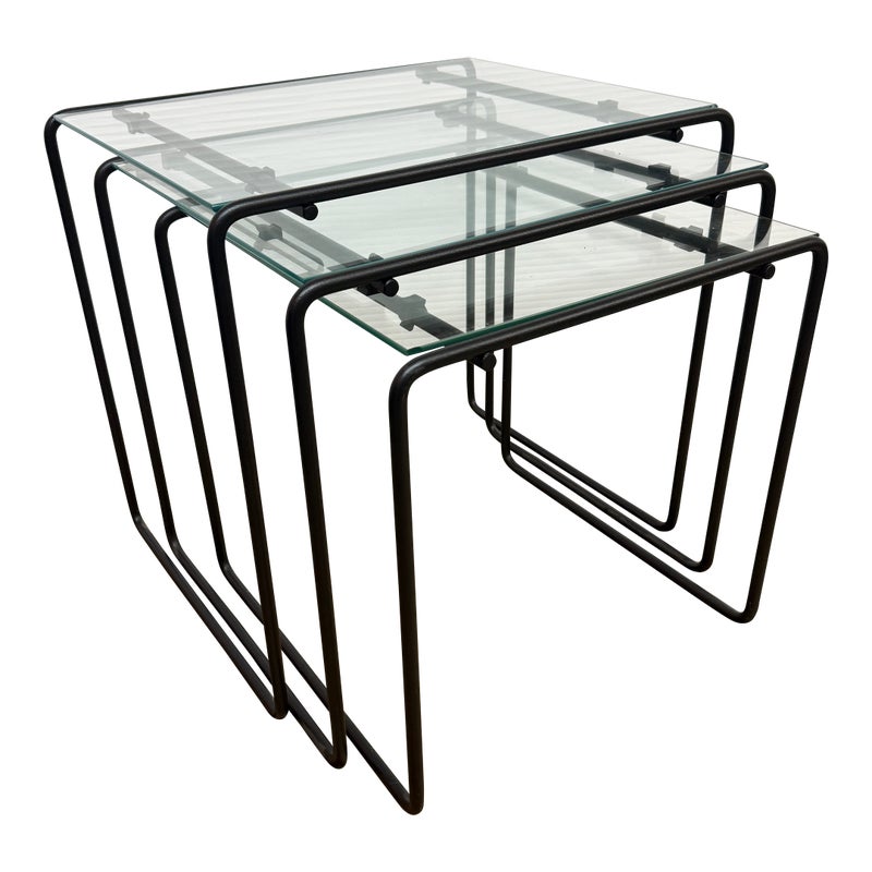 Design Plus Gallery presents a Set of Three Waterfall Nesting Tables. The tables are made from black metal frames that hold tempered glass panes of glass for their table tops. They all fit perfectly into one another and are about an inch and a half in staggered heights. They are all Good overall with one pane of glass on medium table chipped.