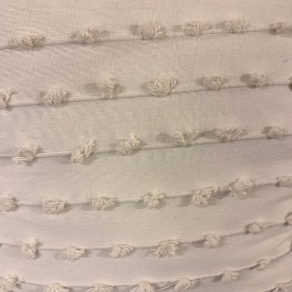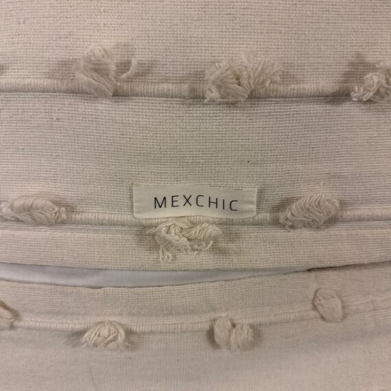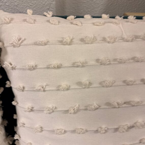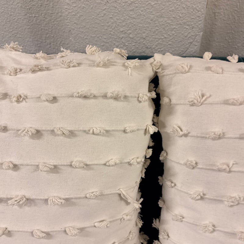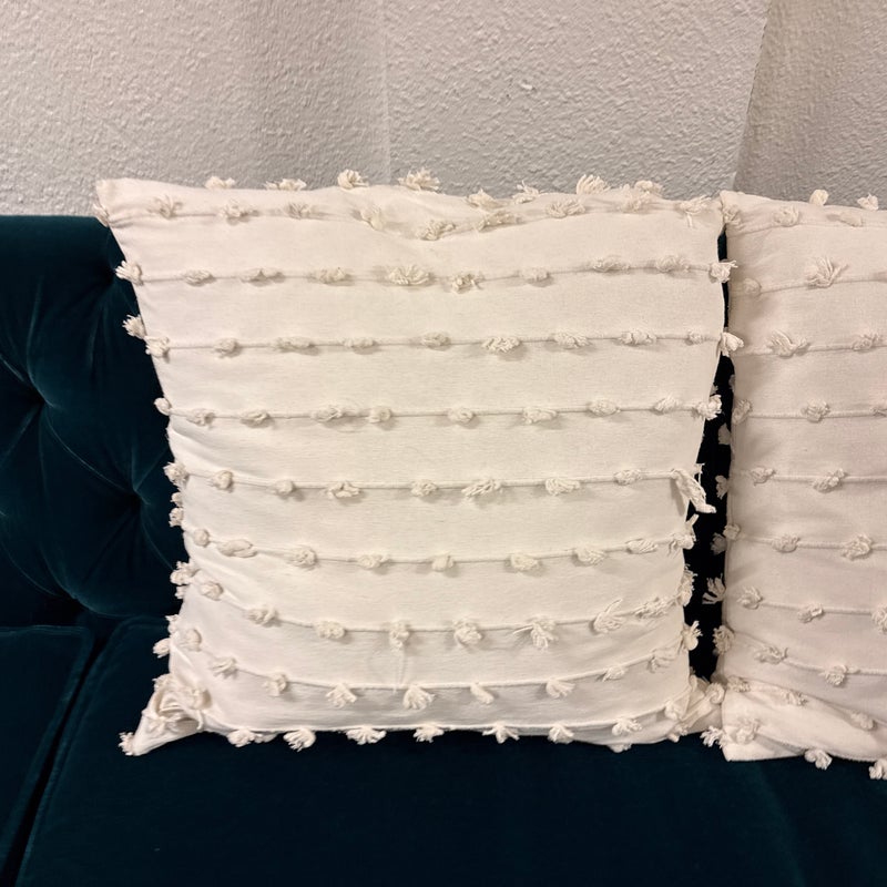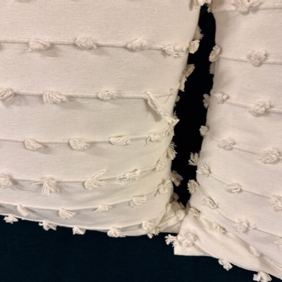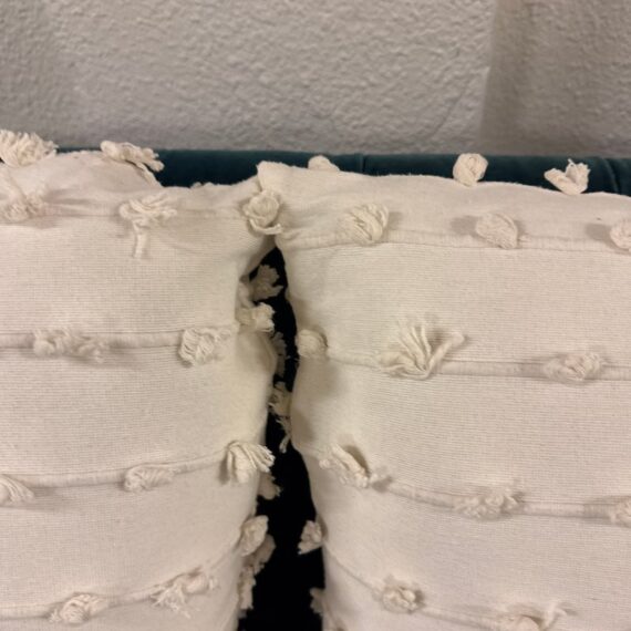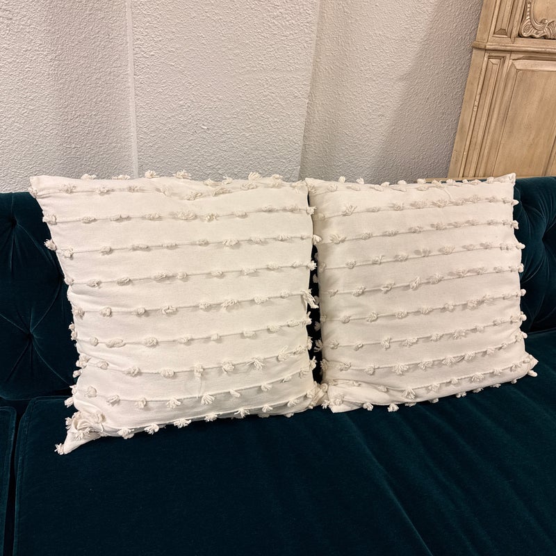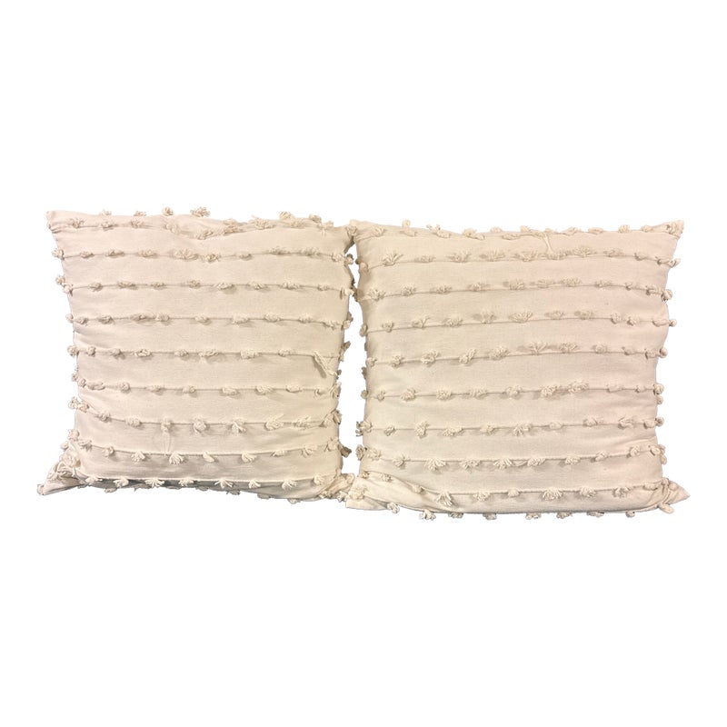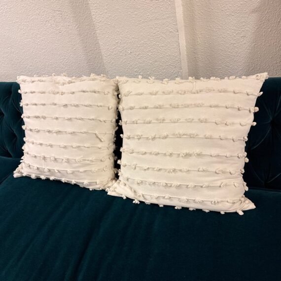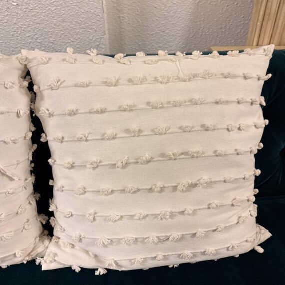 Design Plus Gallery presents a Pair of Pom Pom Pillows from Mexchic. The pillows are too cute, large and in an off white color that can just about go in any setting. They are made from natural materials and have button closures on one side to fit over the pillow fill. They are in good condition for their usage.