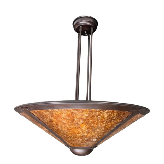 Design Plus Gallery presents a Prairie Chandelier by Mica Lamp Company. Handcrafted of solid copper, assembled with hand driven copper rivets, inset with translucent mica and finished with a rich natural patina. Four copper rods and matching canopy create a clean suspension. Uses four 60 watt bulbs, not included.