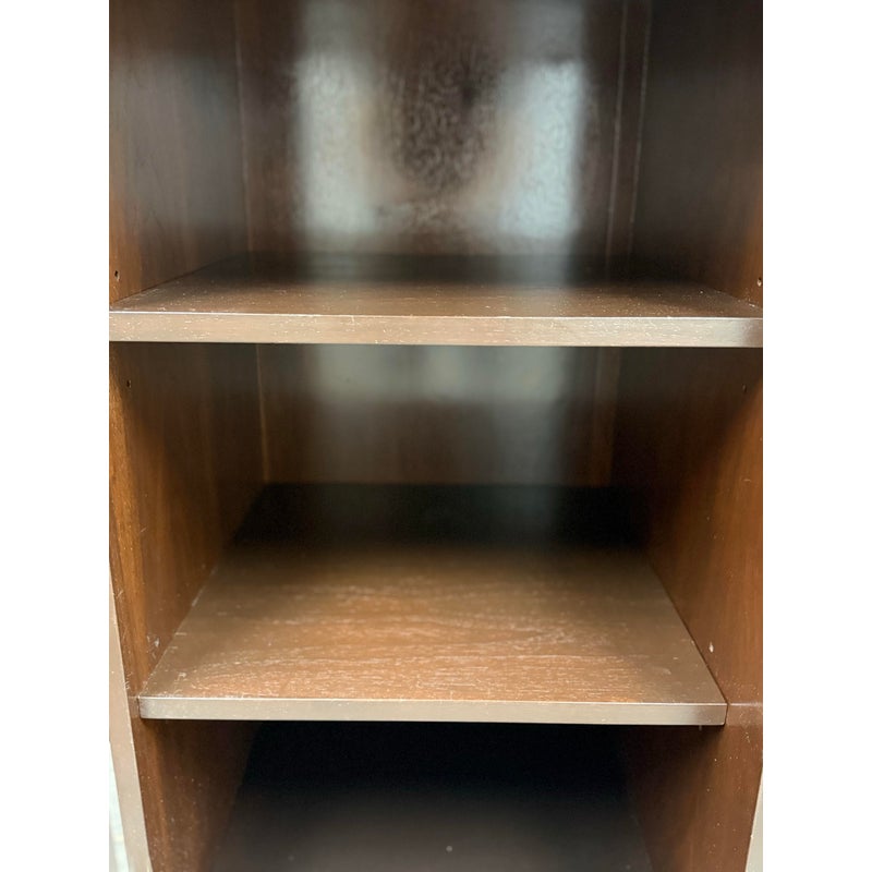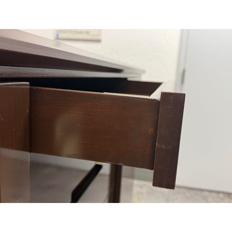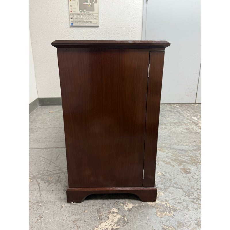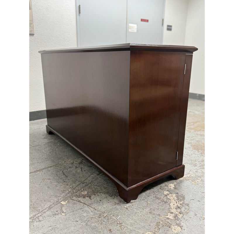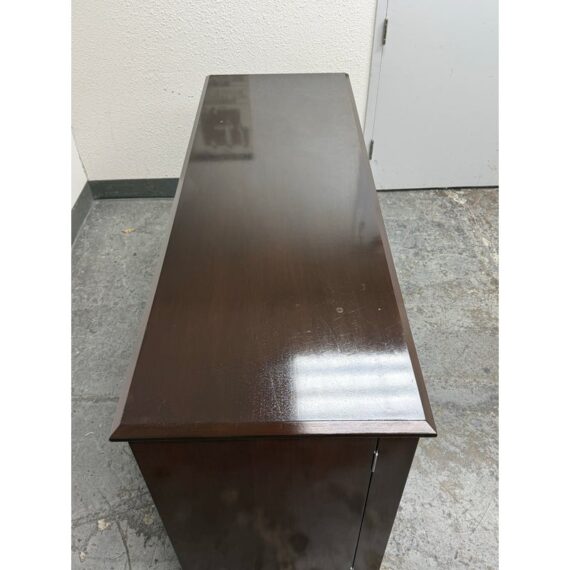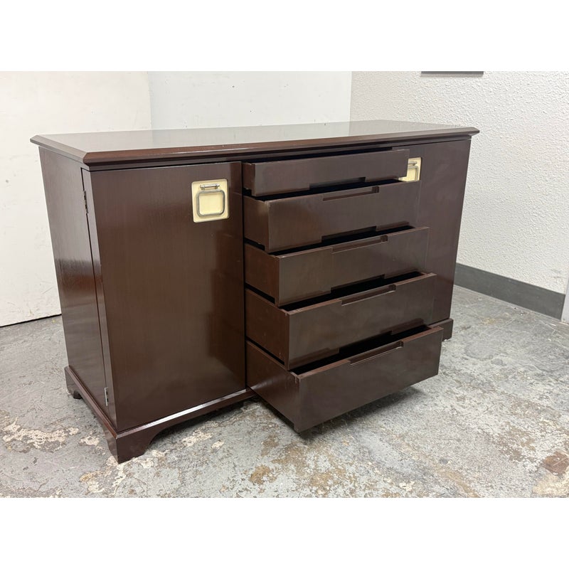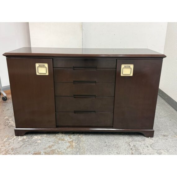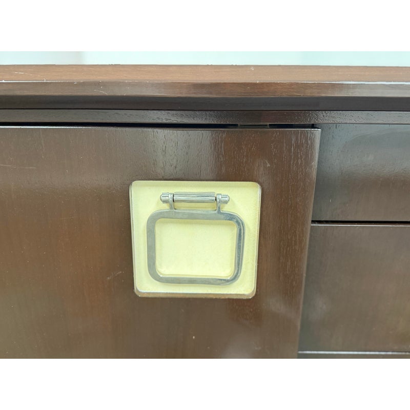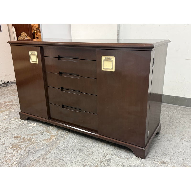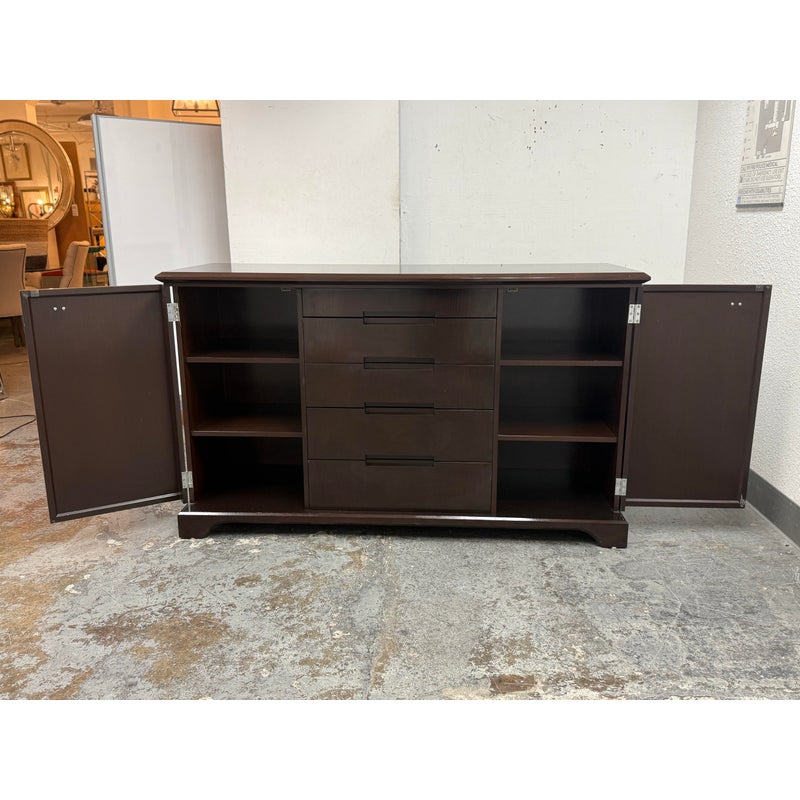 Design Plus Gallery presents the Hayward Dresser from Michael Berman. This bespoke dresser is custom made upon order and has such elegant finishes as well as style. The front center has five staggered depth drawers that effortlessly pull out for structured placements of foldable items. The two side doors open to reveal inner shelving that is removable. Stylistically pleasing the two doors on the side are recessed with a parchment glazed hardware that is so becoming against their (likely) Bronze Glaze finish. The dresser is in good condition with visible and minimal signs of visible wear for its usage. Made in the USA.