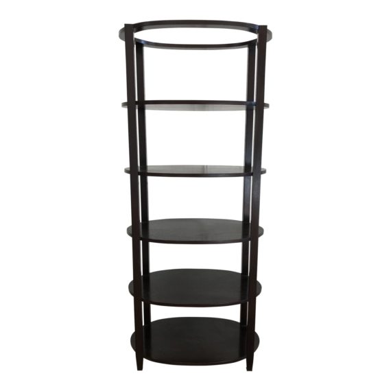Design Plus Gallery presents an Etagere by Michael Berman Limited. An oval beauty, which can be showcased against a wall, a corner or in the middle of a space. Constructed of solid wood in a dark stain finish. Five fixed oval shelves for displaying, the top surface is open to continue the oval shape design. Four chrome plated casters, which makes the unit movable in any direction. Made in Los Angeles. USA.