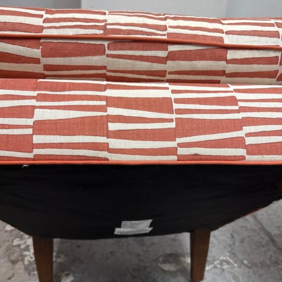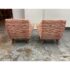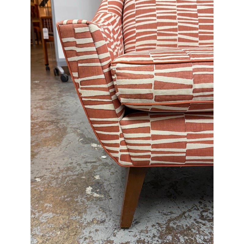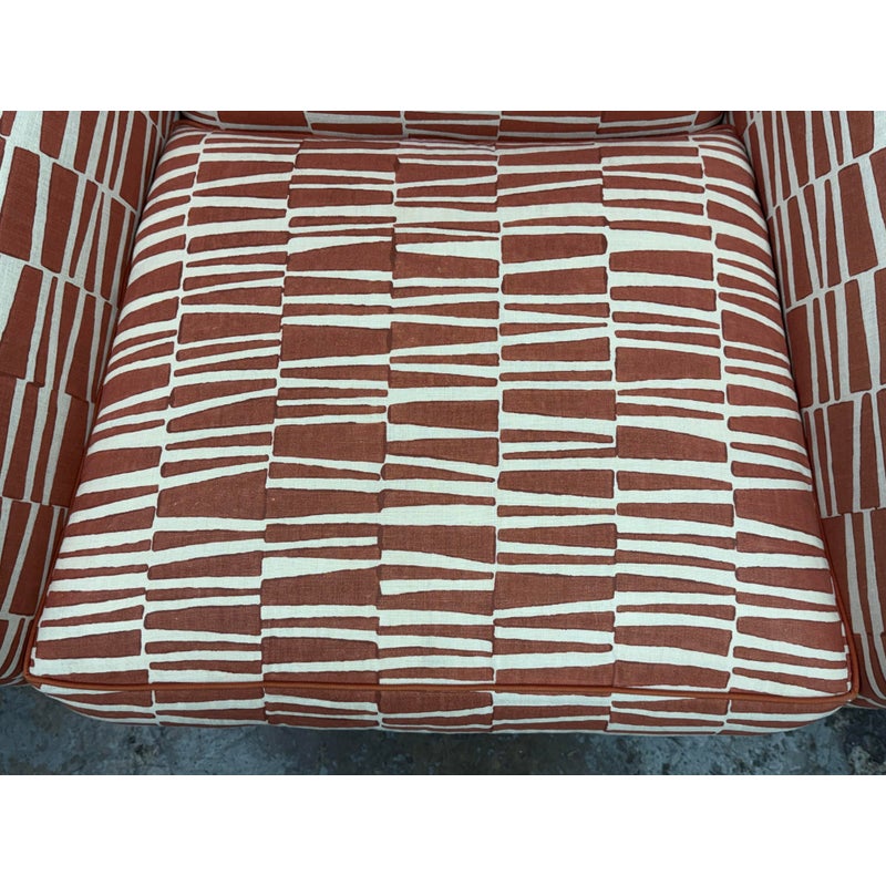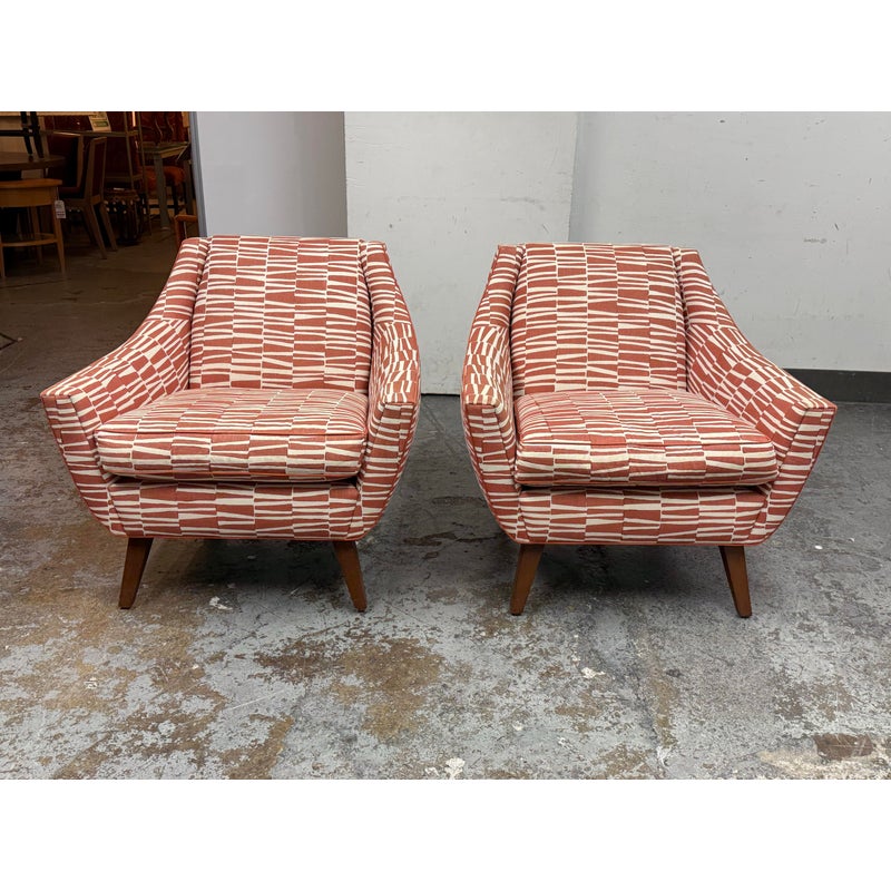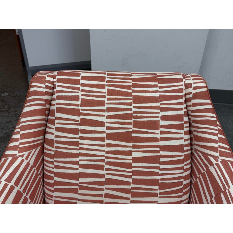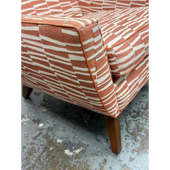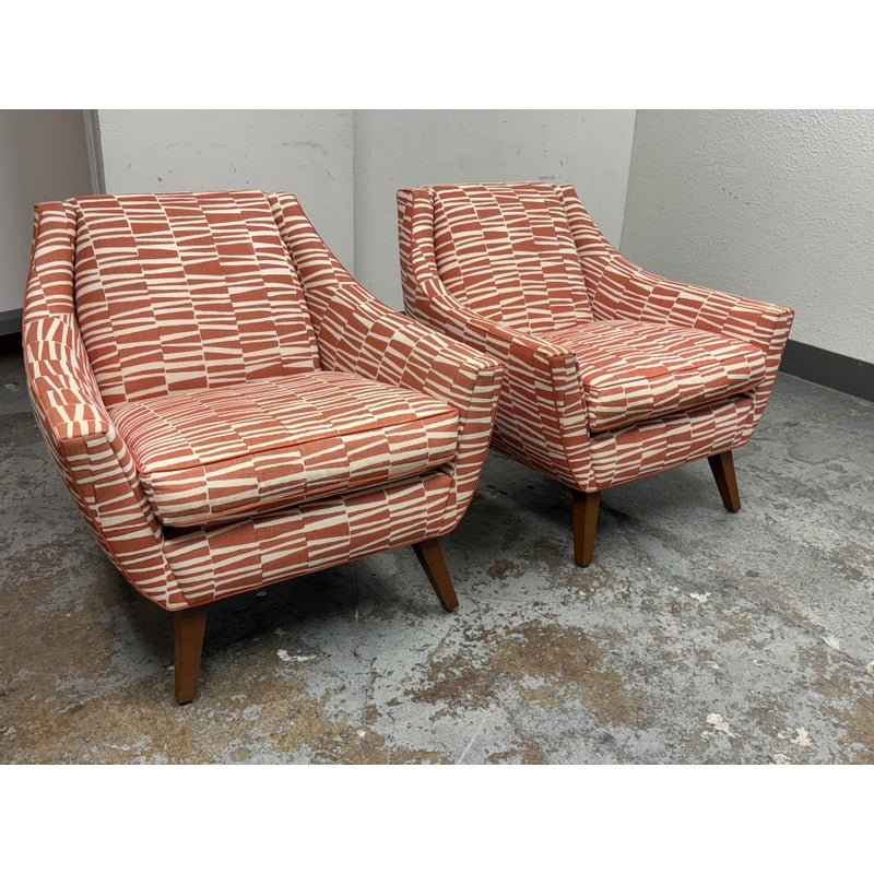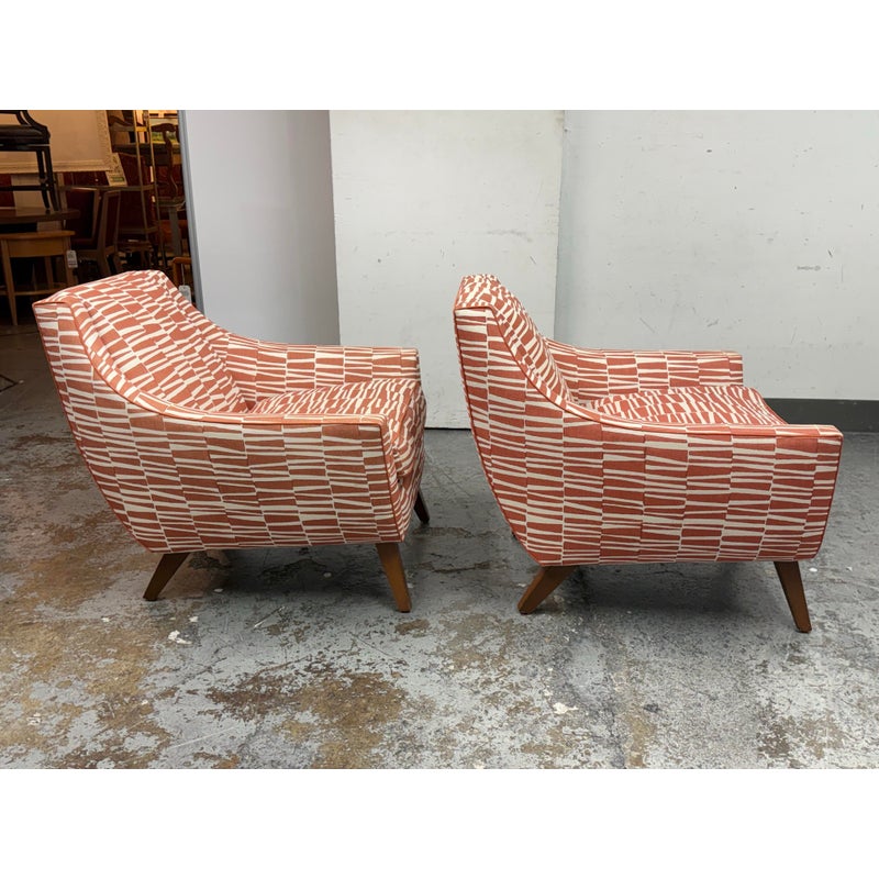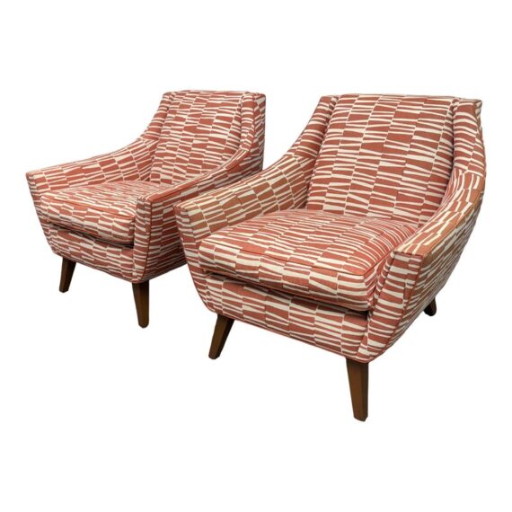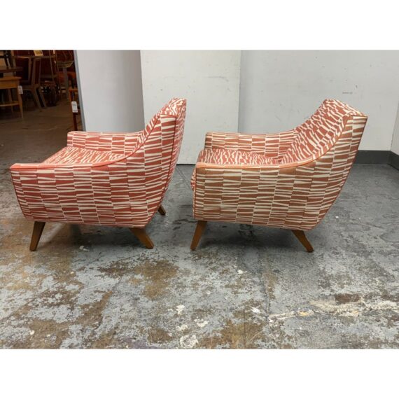 Design Plus Gallery presents a Pair of Summit Lounge Chairs from Michael Berman Limited Furniture. The designer, Michael Berman, signature + sophisticated style artfully marries historic with traditional details with understated modern glamour and welcome livability. The chairs are tailored with a refined Mid 20th Century look that accentuates comfort with a great sense of line and proportion. They have an interesting burnished orange with off-white upholstery, making them uniquely yours. They have minimal visible wear for their age.