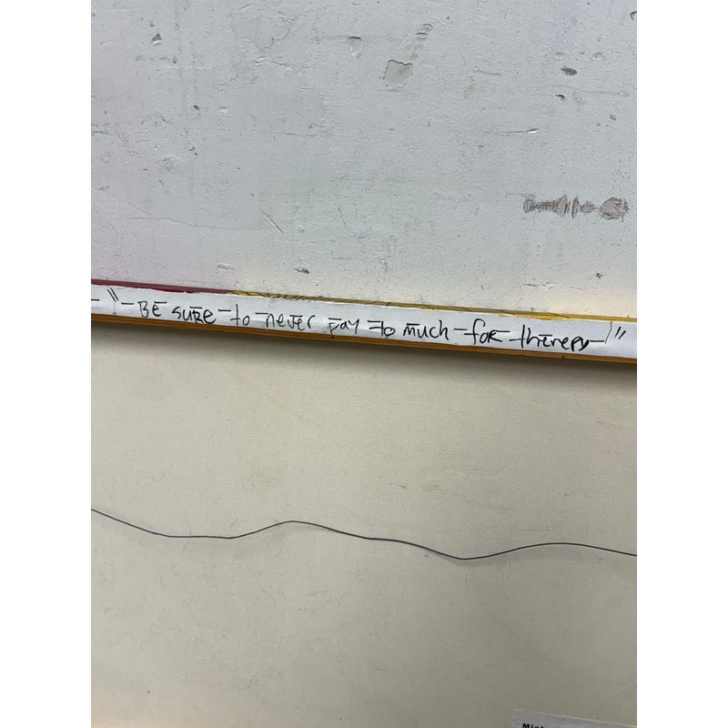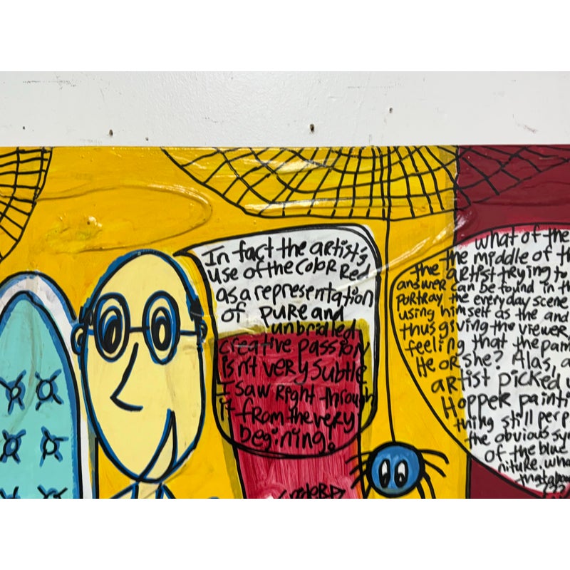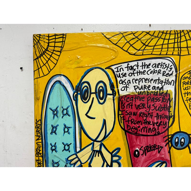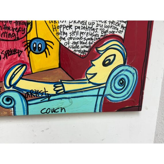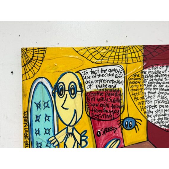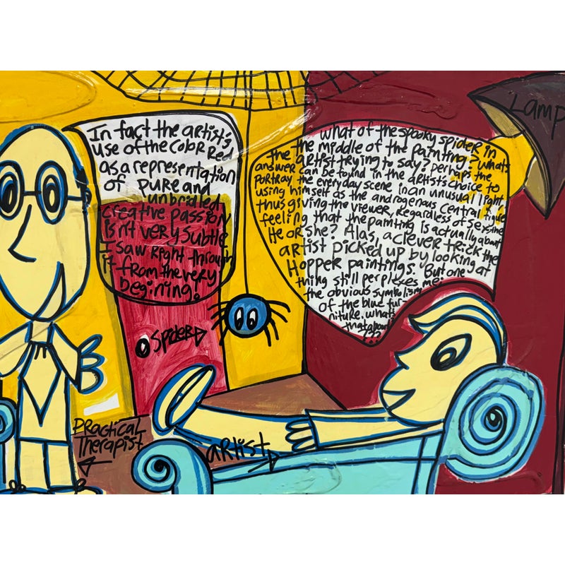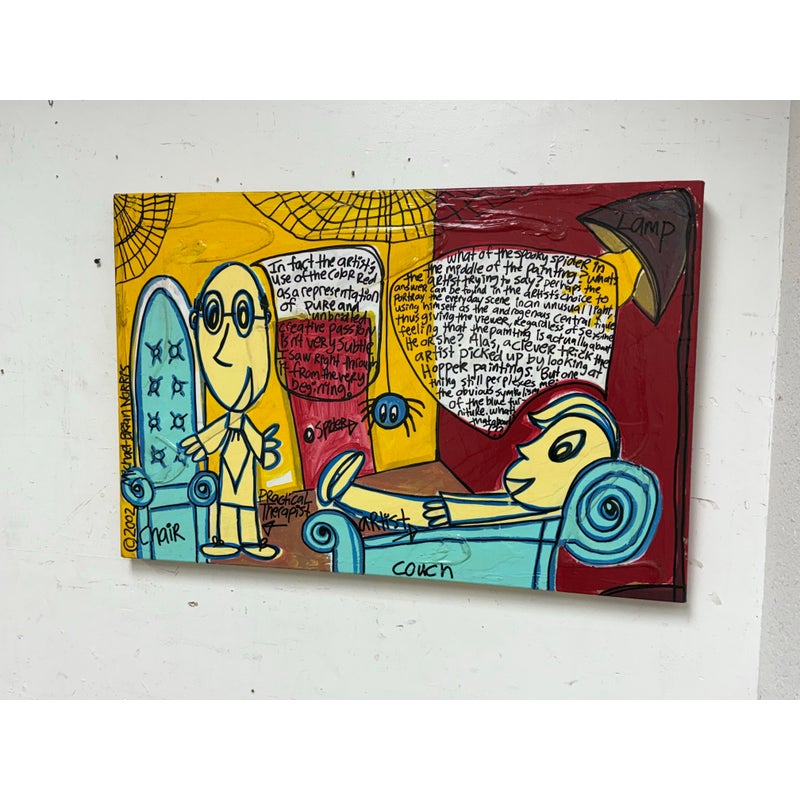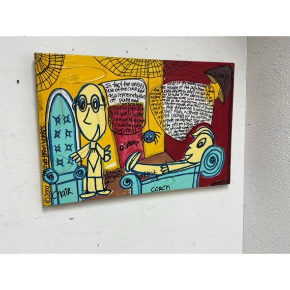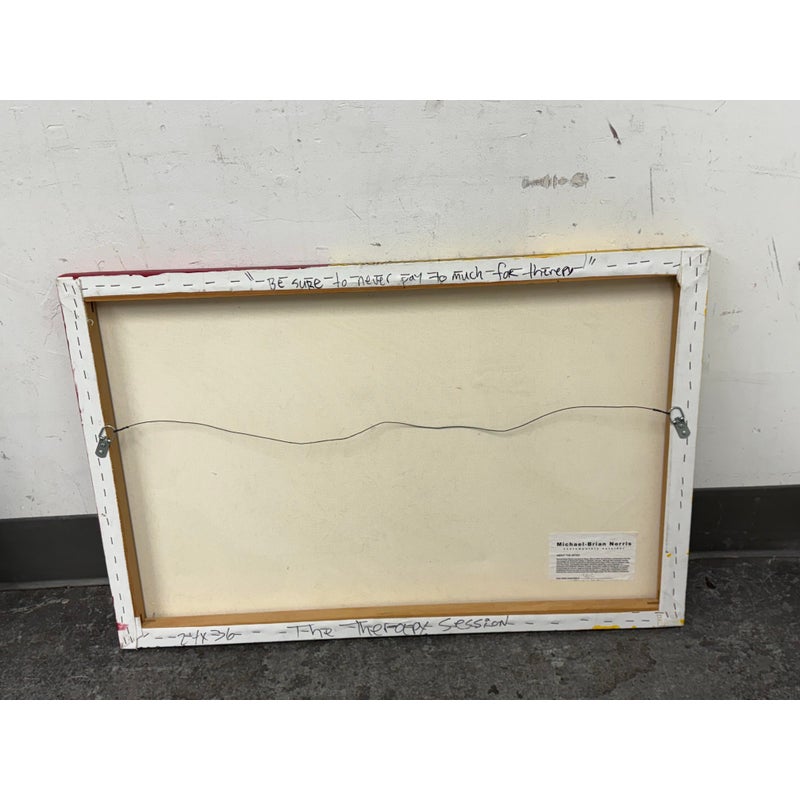 Design Plus Gallery presents an Original Painting titled “The Therapy Session” by Artist Michael-Brian Norris. What a composition with choice of colors that jump out at you; bold reds vibrant yellows and softening turquoise to juxtapose its color creation. Visible text is present to ponder over when you have the chance (typed at the bottom of listing). Signature by the artist in on the backside of art piece. In good condition, minimal wear from usage.
