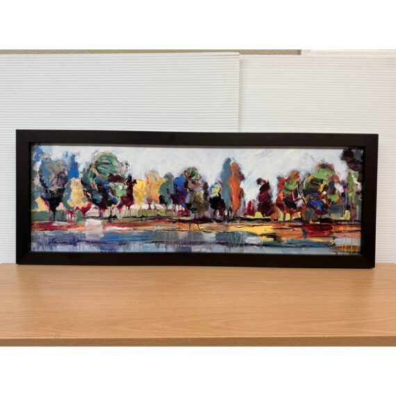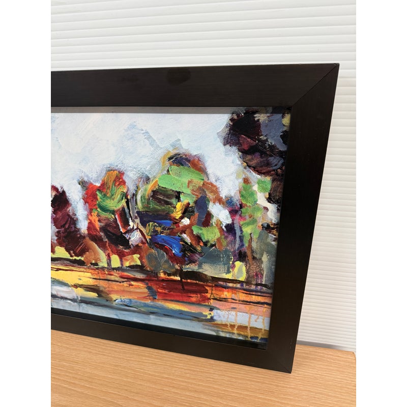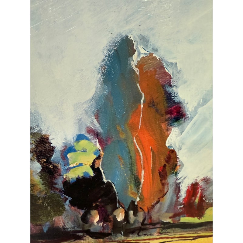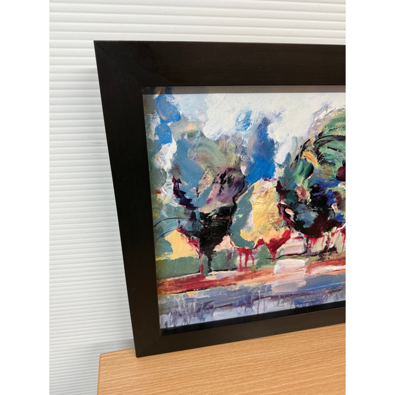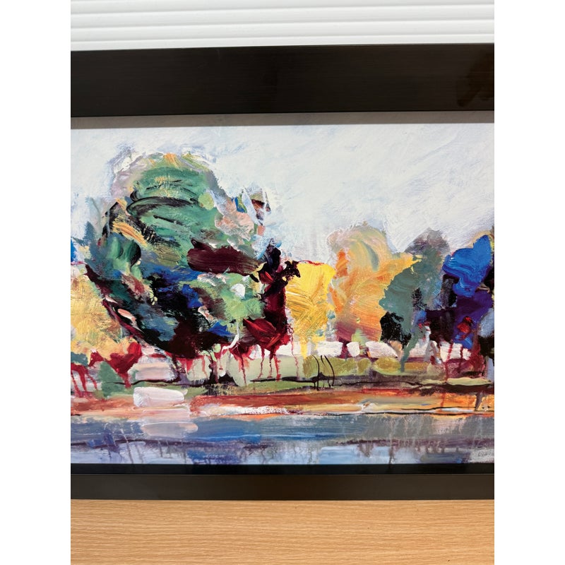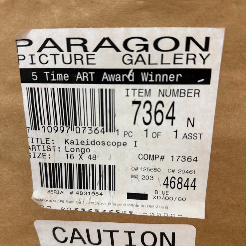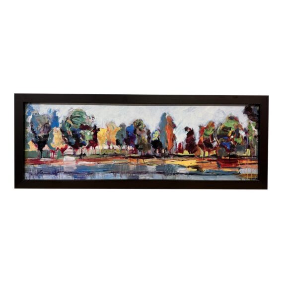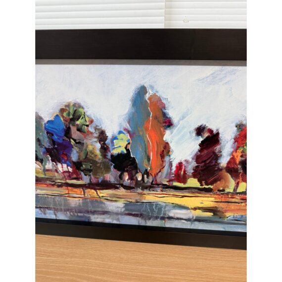 Design Plus Gallery presents Kaleidoscope I by Michael Longo. This is a giclée print, is a high-quality archival digital made with special inkjet printers using pigment-based inks and acid-free fine art papers or canvas, resulting in superior color accuracy, detail, and longevity compared to a standard print. Kaleidoscope I is an interesting landscape print as the colors used to portray a tree lined drive are surprising. The colors are all over the place and fragmented, turning this landscape piece into an optical illusion of sorts. It is in good condition with the frame shop signature, Paragone Picture Gallery, authenticating it for you.