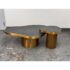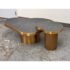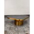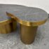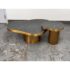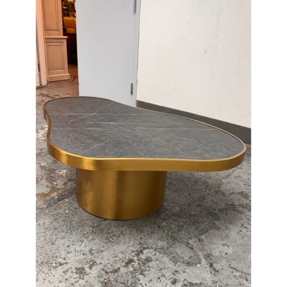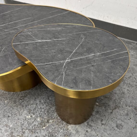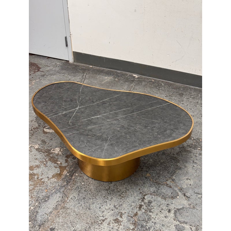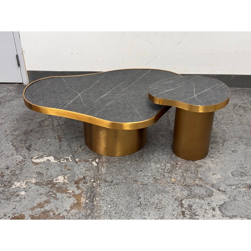 Design Plus Gallery presents a Kidney Shaped Coffee Table + Side Table from Michael Oren Design. The tops of each are of Black Marquina marble with a vinyl protective top cover and they have a slim gold brass-toned metal band to outline the perimeter. The defined edge looks great with its matching tone brass found on their cylindrical pedestal bases. The organic kidney silhouette balances the weight of the stone with a streamlined profile, and the marble veining delivers natural variation across the surface. They are good condition with visible and minimal wear from usage.
