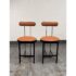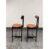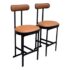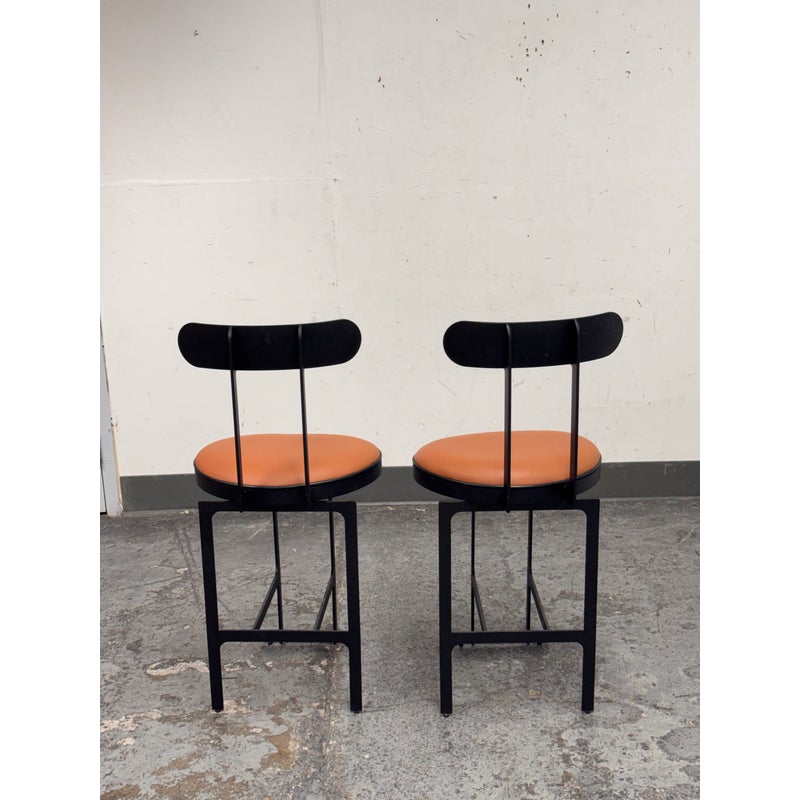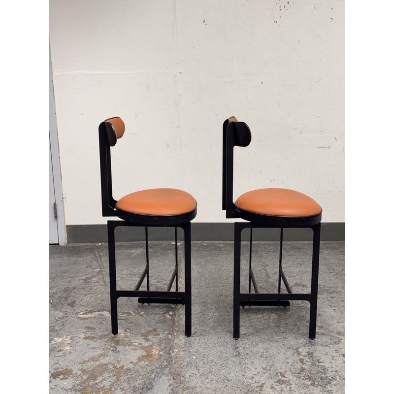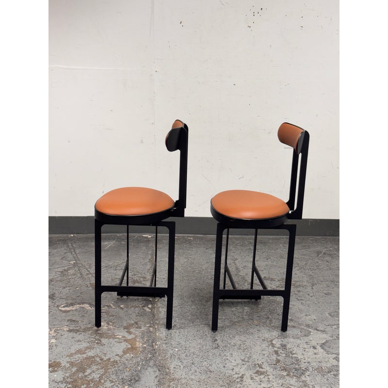 Design Plus Gallery presents a Pair of Swivel Counter Stools from Michael Oren Design. These stools are in the style of the Park Place Stools by Man of Parts. The pair have rounded faux leather seats in caramel tone with a padded backrest band. Slim black metal frames keep the profile light, while integrated stretchers and a footrest add stability. The seats swivel smoothly for easy movement, and the streamlined silhouette highlights the contrast between the upholstery and metalwork. They are in good condition with visible chips on the metal finish from usage.