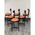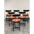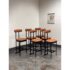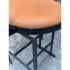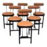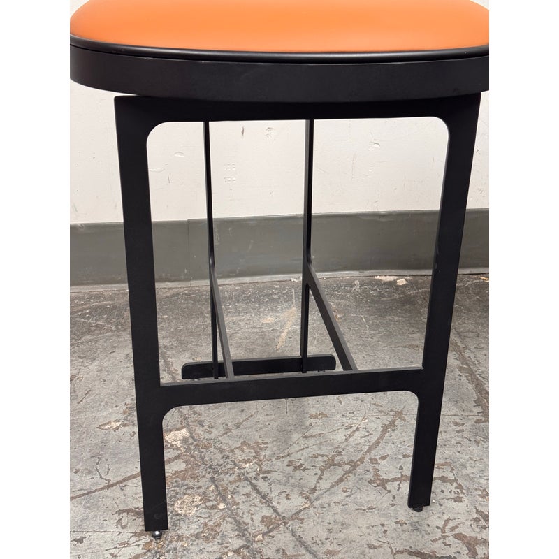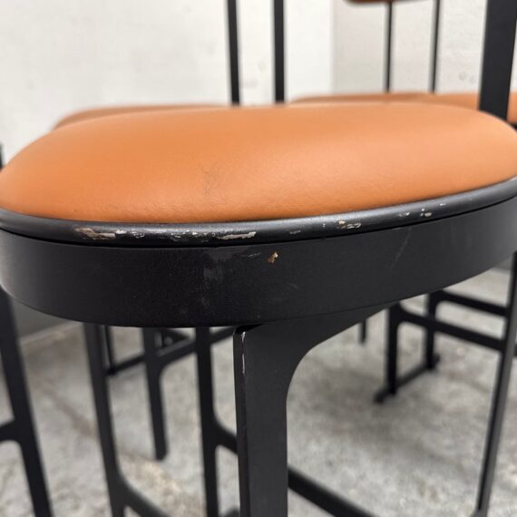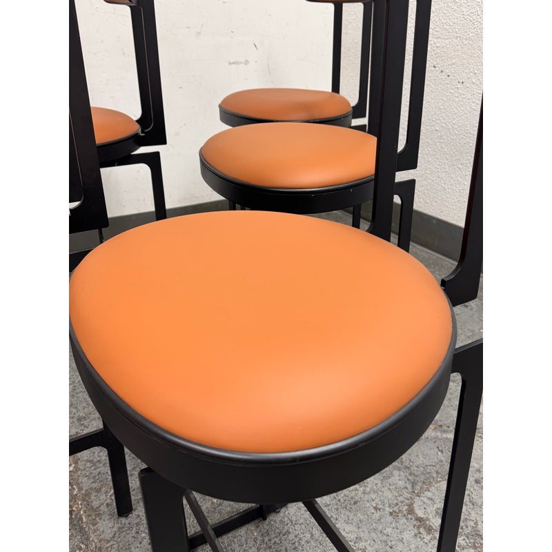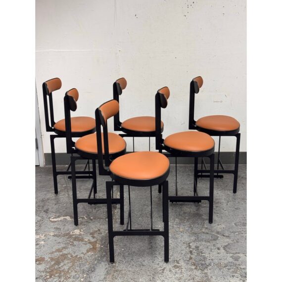 Design Plus Gallery presents a Set of Six Swivel Counter Stools from Michael Oren Design. These stools are in the style of the Park Place Stools by Man of Parts. The pair have rounded faux leather seats in caramel tone with a padded backrest band. Slim black metal frames keep the profile light, while integrated stretchers and a footrest add stability. The seats swivel smoothly for easy movement, and the streamlined silhouette highlights the contrast between the upholstery and metalwork. They are in good condition with visible chips on the metal finish from usage.