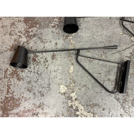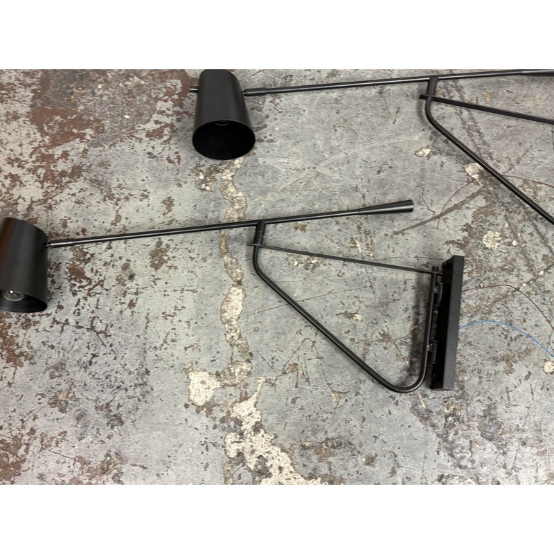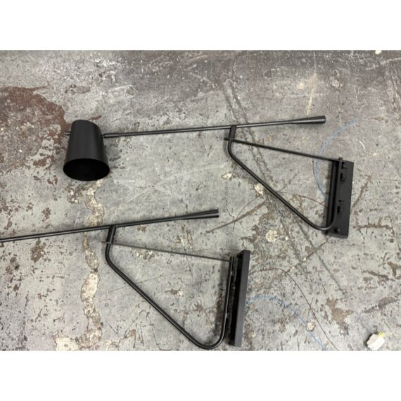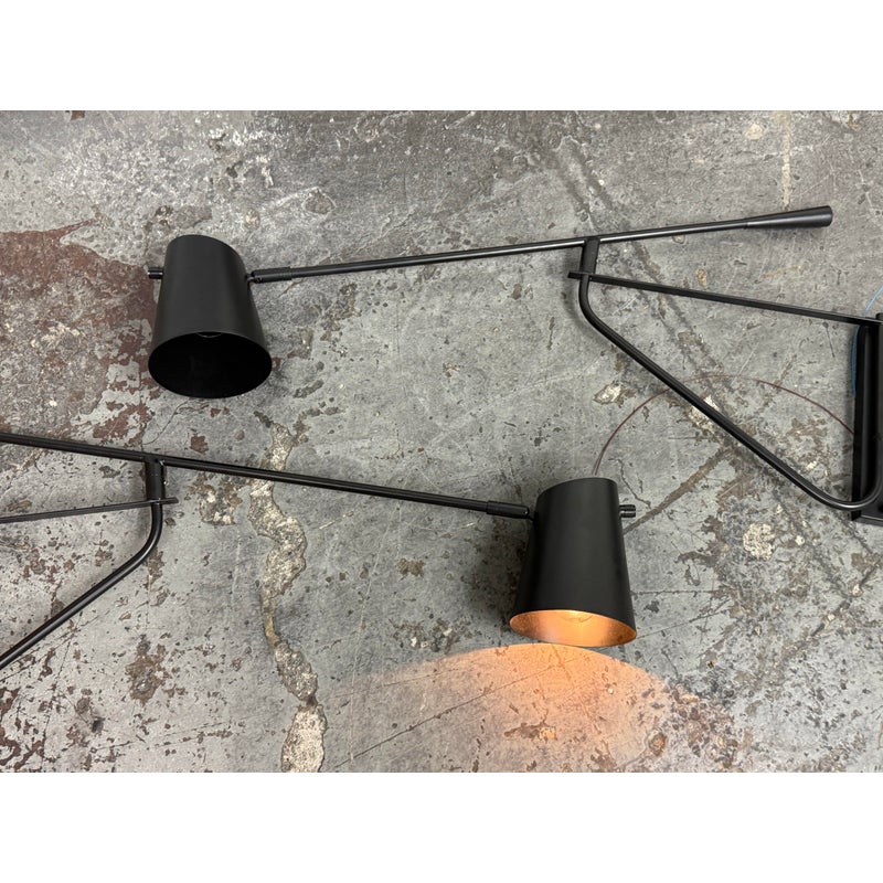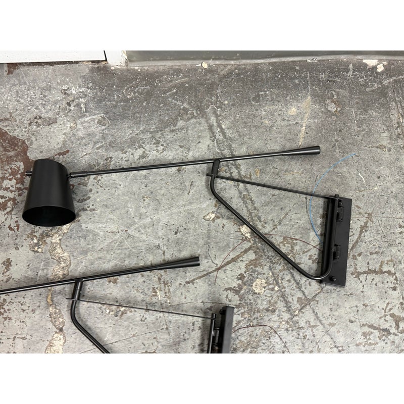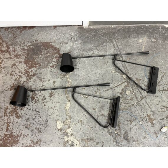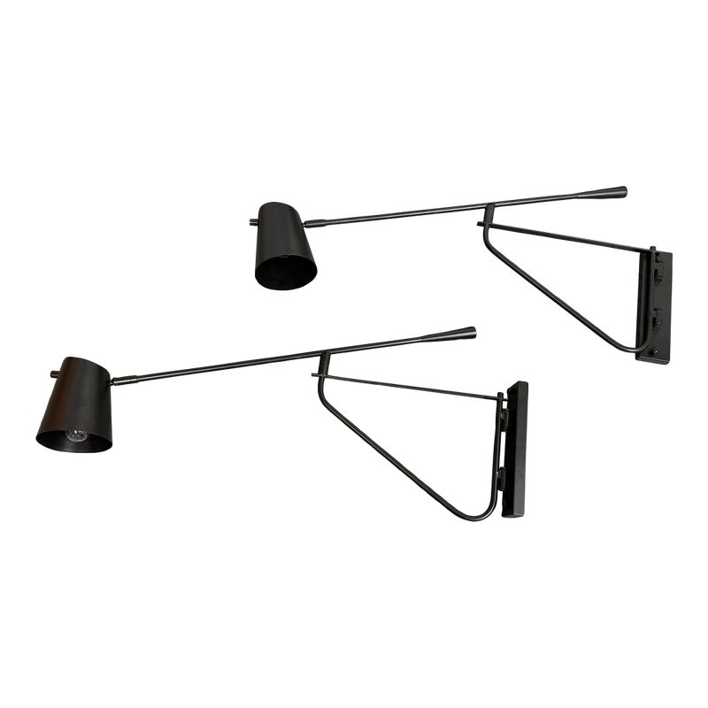 Design Plus Gallery presents a Pair of Swing Arm Sconces from Michael Oren Designs. These matching sconces are made of metal in a black finish and have a wall plate with an articulated swing arm. Each sconce holds a single light and is topped with a cylindrical shade, while the arm swivels for adjustable positioning and the head pivots for directed light. They are in good condition with minimal wear from usage.