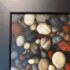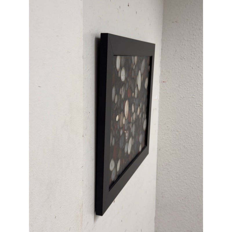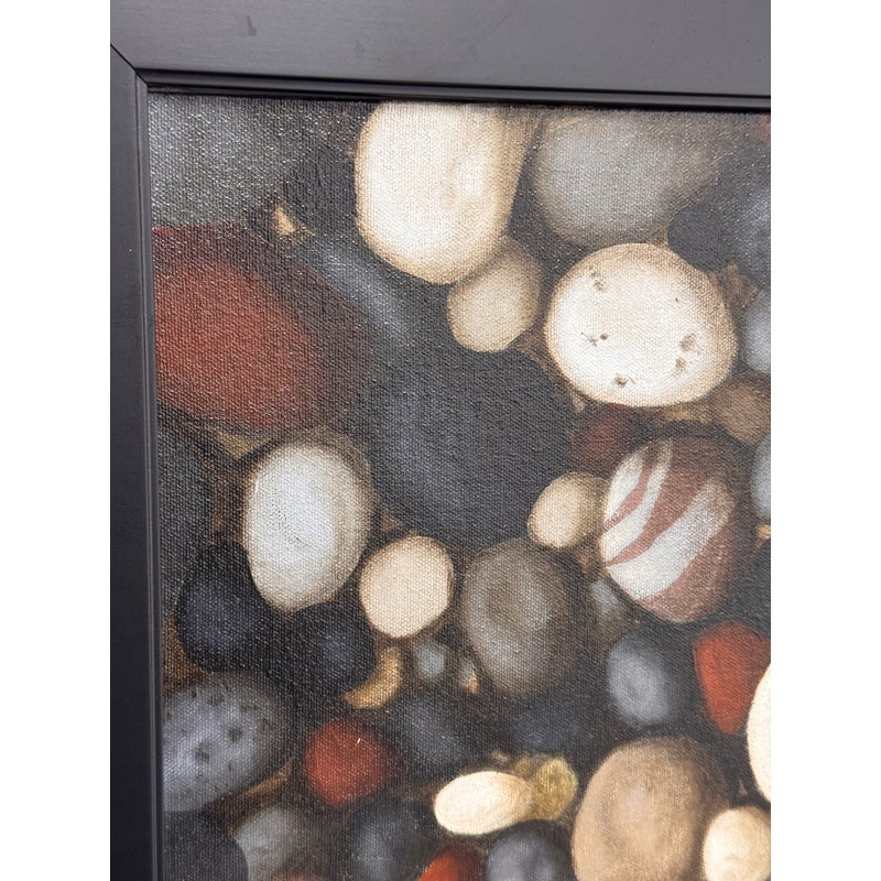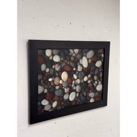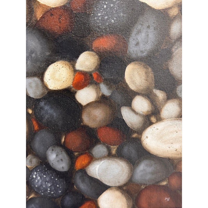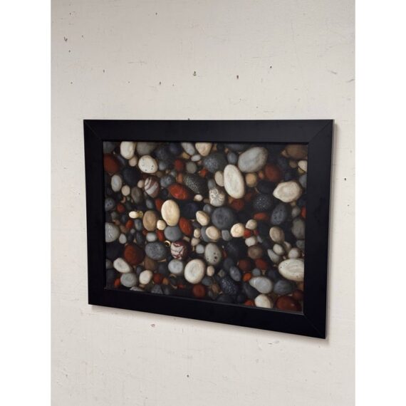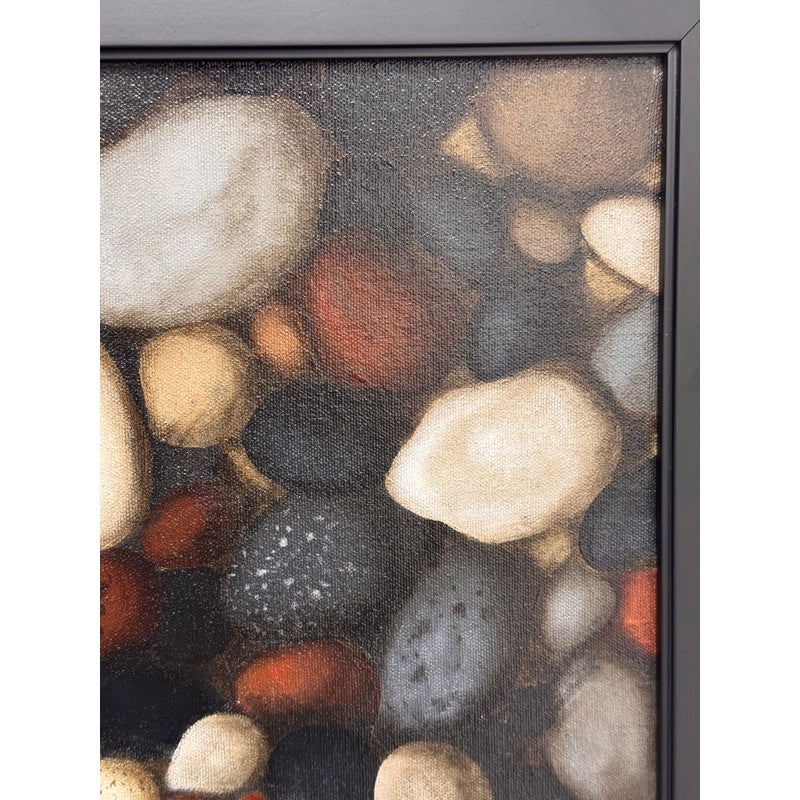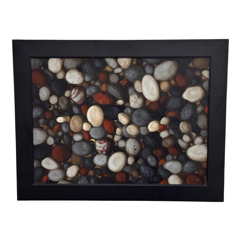 Design Plus Gallery presents “Love Found” an Original Oil Painting by Michael Skidmore. This hand-painted work captures a field of smooth shoreline stones in layered tones of charcoal, slate, ivory, and rust, with a small wedding band tucked among the rocks as the focal detail. The composition is highly detailed, with carefully rendered textures and subtle shifts in color that create depth across the surface. The painting is presented in a black frame for a tailored presentation. It is in good condition with visible and minimal wear from usage.