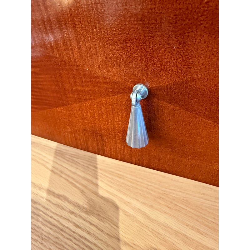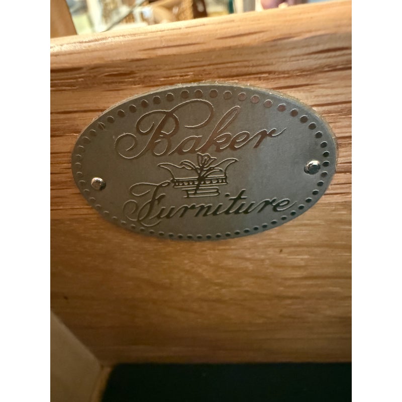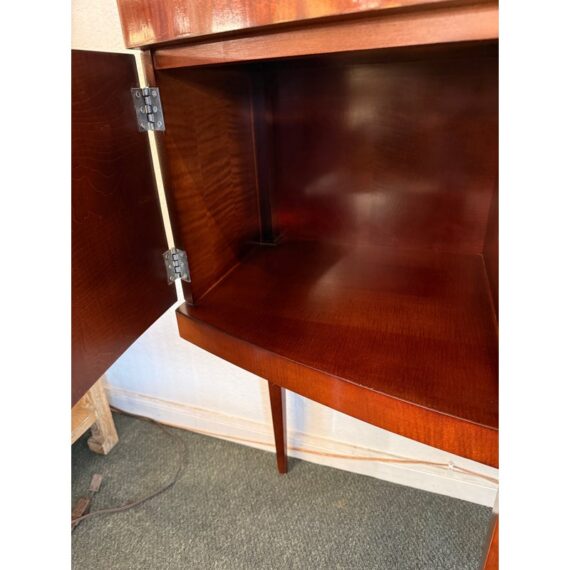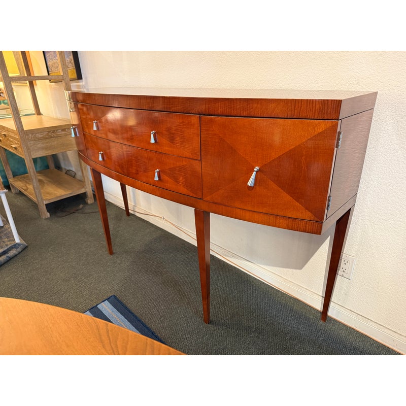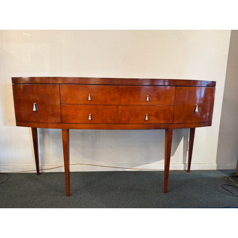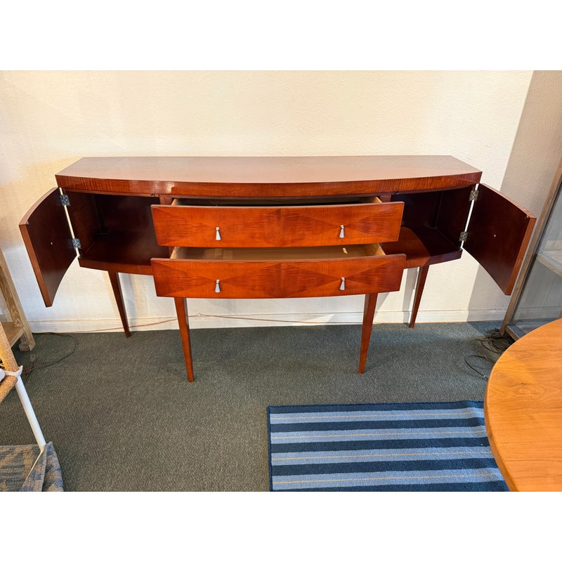 Design Plus Gallery presents the Archetype Credenza by Michael Vanderbyl for Baker Furniture. The credenza is made from solid mahogany wood with a gleaming lacquer that shines up the auburn tone to perfection. The symmetrical sideboard has a door on either side with an empty cavity space for glasses and other taller items. There are two center drawers with the top one having anti-tarnish felt pads for your silver. The brand plate is in the top center drawer for authenticity, and the credenza is no longer in production with the brand. It is in good overall condition with minimal wear for its usage. Made in the USA