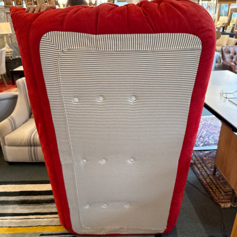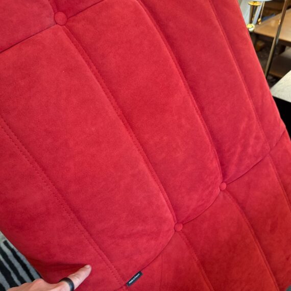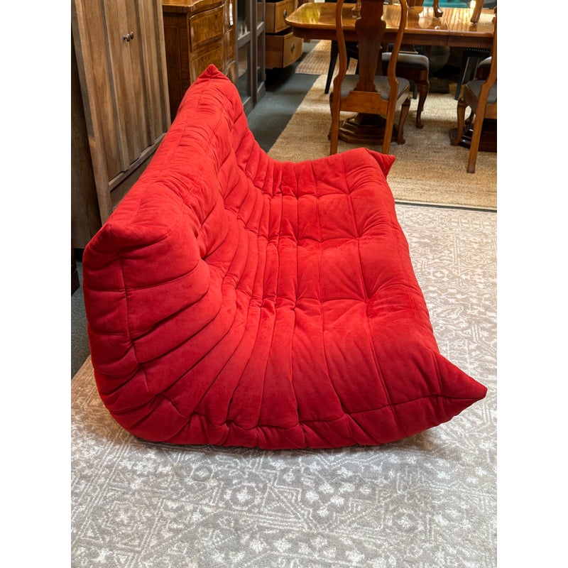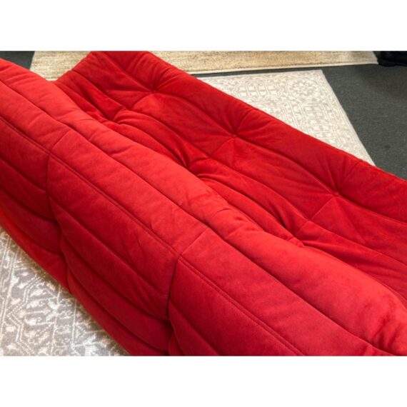 Design Plus Gallery presents the Togo Armless Sofa by Michel Ducaroy for Lignet Roset. A Ligne Roset classic, Michel Ducaroy’s Togo has been the ultimate in comfort and style for over forty years. The timeless collection offers an ergonomic design with multiple density polyether foam construction and quilted covers, making each piece both visually attractive and physically inviting. The piece is upholstered entirely in their Alcantara fabric that is considered the benchmark of high-end microfibre brand, easy to clean and extremely hard-wearing. A soft feel with an incomparable velvety effect in their Goya Red. The sofa is in good condition for its usage with minimal signs of visible wear for its usage. Made in France.
