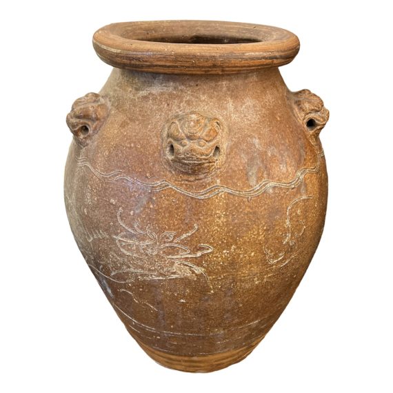 Design Plus Gallery presents an Antique Chinese Lion Head Jar. Estimated about 300 years old. A rare and unique piece of history. Handcrafted clay pottery, this jar features four lion heads and an etched dragon that wraps around the jar, giving it a distinctive and eye-catching look. With its distressed finish from age, this jar is a beautiful piece for display in your home. A true antique charm. Visible minor wear consistent with age and use. A perfect addition to any home décor collection.