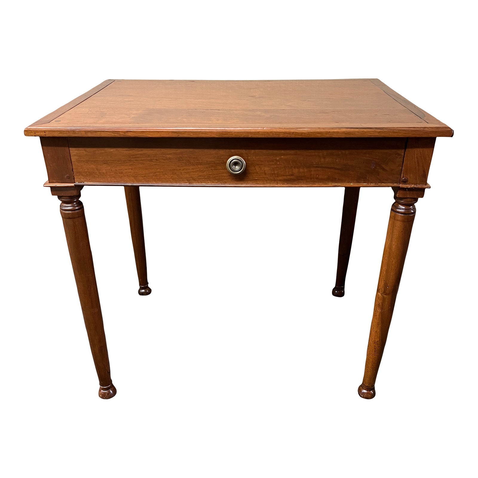 Design Plus Gallery presents a Mid 19th Century French Walnut Table. From the LL-de-france region. Crafted from walnut woods. The table is an antique French design from the mid 19th century, making it a unique and beautiful piece. A single pullout drawer, that provides extra storage space for items such as stationery or small accessories. The drawer is lined with red fabric, adding a pop of color to the piece. The round textured brass pull knob on the drawer adds a decorative element and complements the overall design of the table. The table stands on four spindle legs, which not only provide stability but also add a touch of charm and traditional style to the piece. Due to its compact size and versatile design, this wood table is suitable as a small writing desk. Its smooth tabletop provides ample space for writing, working on a laptop, or even displaying decorative items such as a vase or photo frame. Visible and minor wear from usage + age. Antique condition.