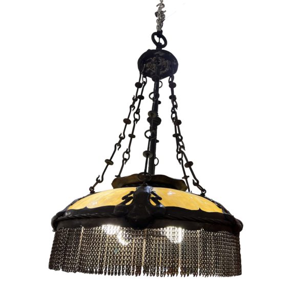 Design Plus Gallery presents a 19th Century Marble Swirl Glass Bronze Chandelier. Solid bronze frame is beautifully hand forged with a curved silhouette. Panels are filled with a swirl marbled glass of ivory and cream. The decorative chain, canopy and drop chain all beautifully coordinates with the bronze patina. Minor wear from usage and age, chandelier is in good condition. Salved from a commercial space in Pittsburgh Pennsylvania and re-wired from being gas powered.