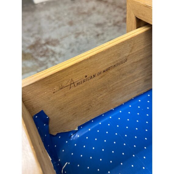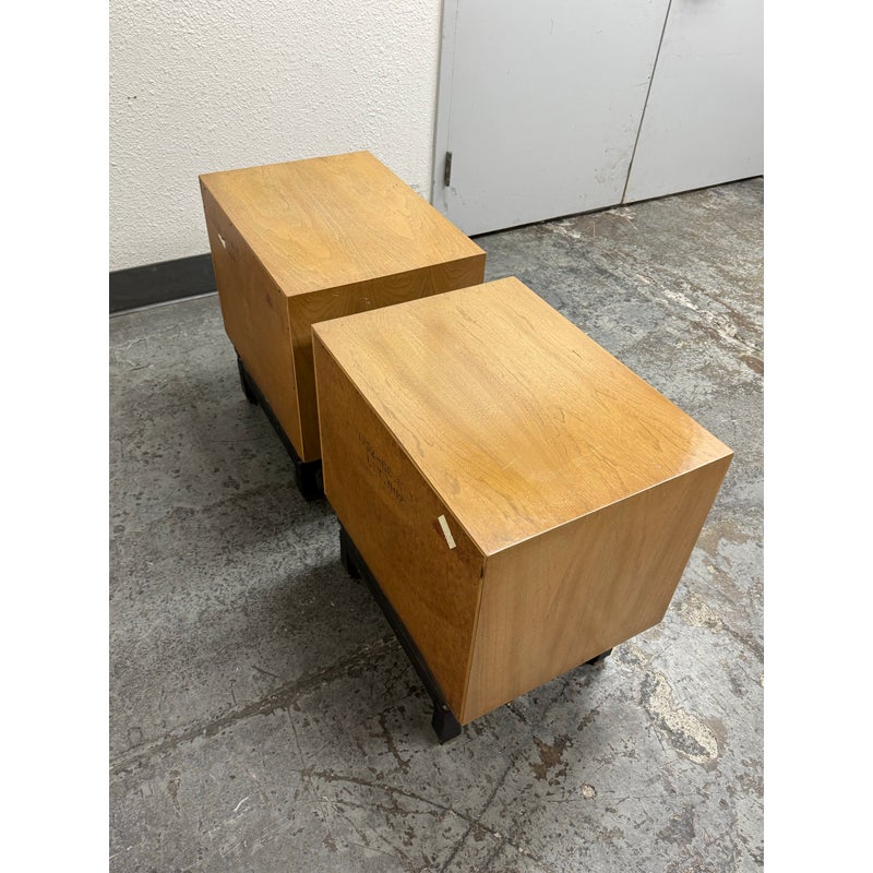 Design Plus Gallery presents a Pair of Blonde Walnut Nightstands by American of Martinsville from the Late 20th Century. These nightstands are made from solid walnut with a light blonde finish, smooth top, brass hardware, black painted slightly raised base on four legs with base caps. Features two half width top drawers and a lower full width drawer all having dovetail construction. These are discontinued models with the brand; they are in good condition for their vintage usage. Made in the USA