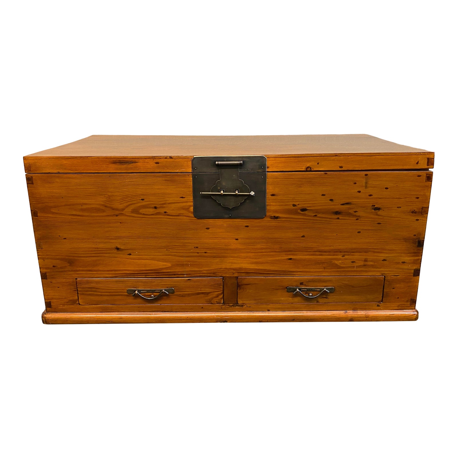 Design Plus Gallery presents a Mid 20th-Century Asian Chest + Tray. Wood stain and gloss in applied to the rich wood and is joined with exposed dovetail detail. Comes with beautiful oiled brass hardware and two small drawers at the base. Self stabilizing hinged top opens to reveal a tray on top third of the opening. Little evidence of wear.