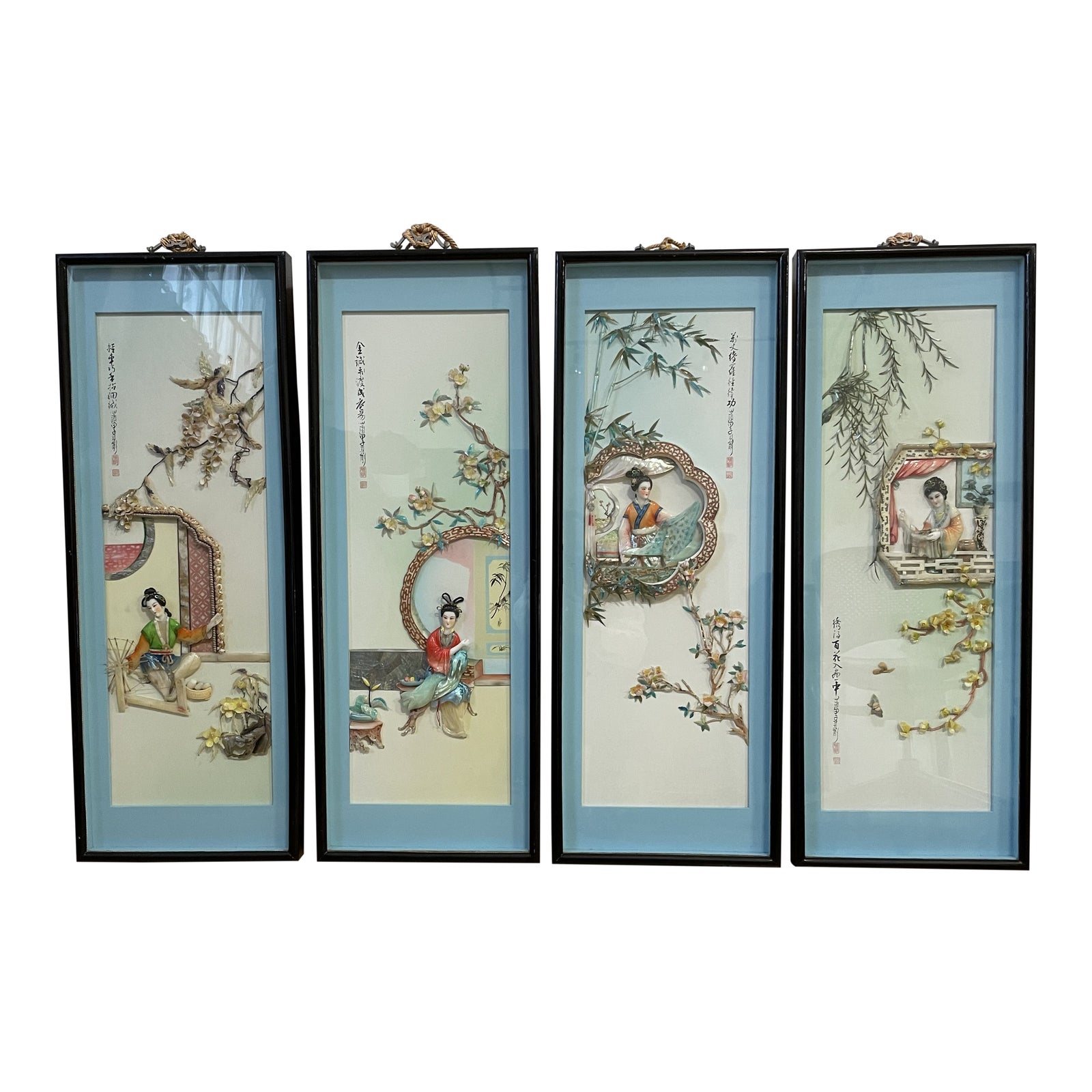 Mid 20th Century Asian Enamel Three Dimensional Shadow Box Panels – Set of Four
