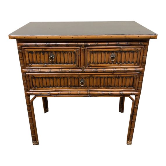 Design Plus Gallery presents a Mid 20th Century Bamboo Accent Table. In the style of a McGuire or Palecek work of art. Indonesian flair and warmth mixes well with any style and neutral. Small proportions and internal storage makes this a convenient entry piece. Top is finished with a black paint and has visible wear (pictured.) Airy base with high legs gives enough space to store additional items or have the perfect pouf and ottoman on stand by. Bamboo is treated with a rich Chestnut stain and black accenting. Three drawers come with oiled brass hardware pulls.
